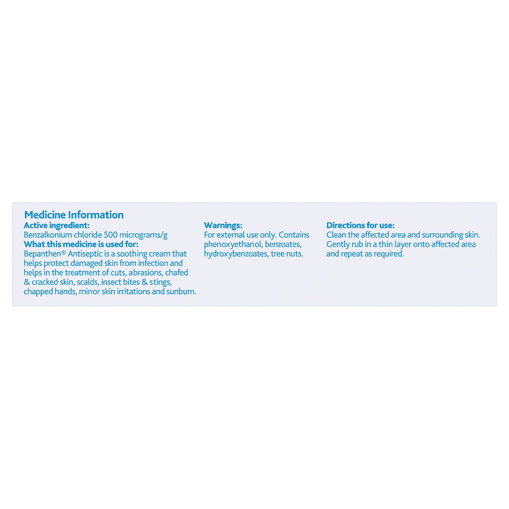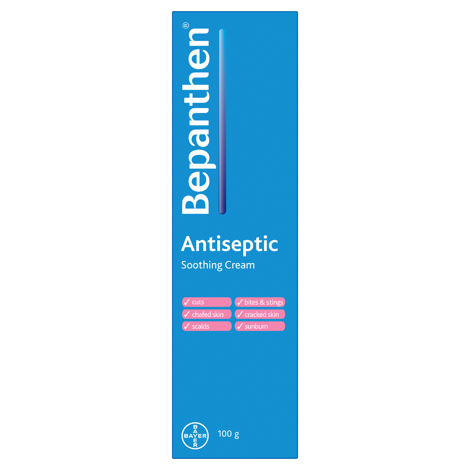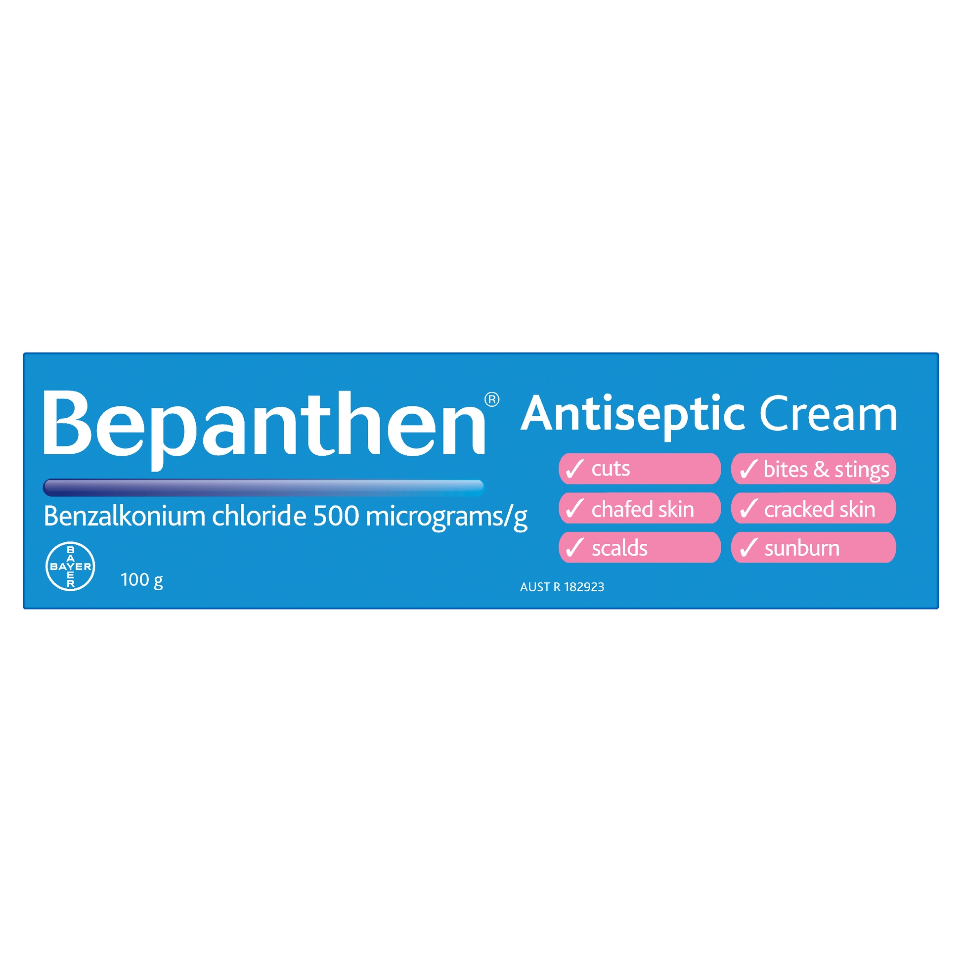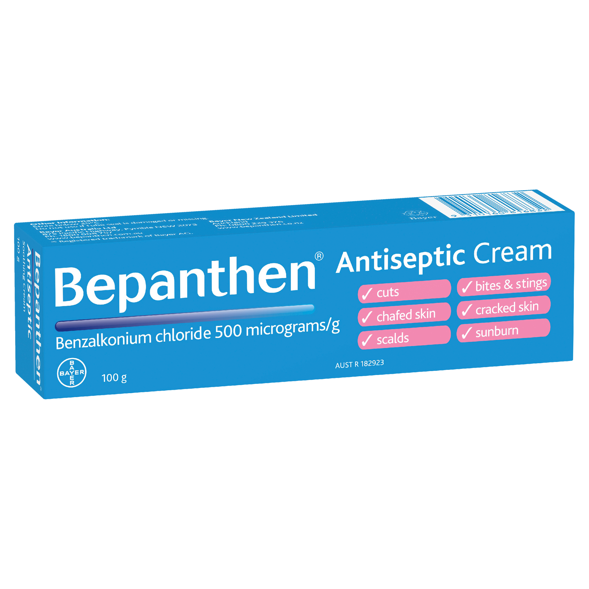 Bepanthen is an multi-purpose antiseptic cream that helps protect damaged skin from infection and is also effective for the treatment of cuts, abrasions, chafed & cracked skin, scalds, insect bites & strings, chapped hands, minor skin irritations and sunburn. Bepanthen Antiseptic cream helps the skin to repair. Gentle enough to be used on baby skin.