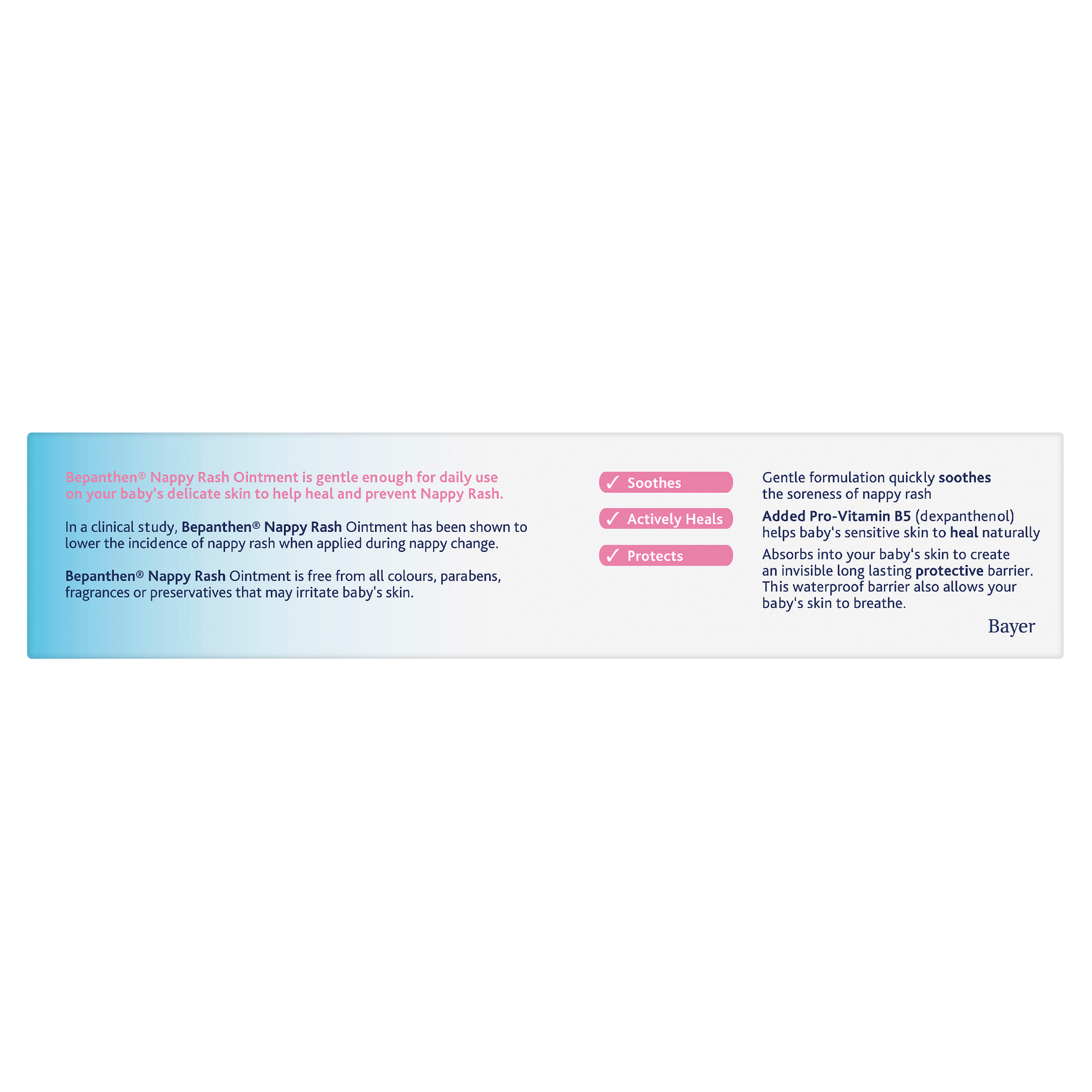 Bepanthen Nappy Rash ointment has a unique dual action to help treat and prevent nappy rash whilst providing a soothing relief for your baby. Bepanthen Nappy Rash is specifically formulated for baby's delicate skin. Bepanthen Nappy Rash ointment helps protect against nappy rash and keeps the baby’s skin hydrated whilst providing a long lasting breathable waterproof barrier. It also contains Provitamin B5 (dexpanthenol) which acts to repair baby’s skin. If your baby has nappy rash, Bepanthen Nappy Rash's gentle formulation quickly soothes the soreness and aids natural skin healing. Free from all colours, fragrances and preservatives, so it’s the gentle choice to help treat and prevent baby’s nappy rash. A clinical study1 has shown that using Bepanthen® Nappy Rash to help protect baby’s skin at every nappy change leads to a lower incidence of nappy rash.