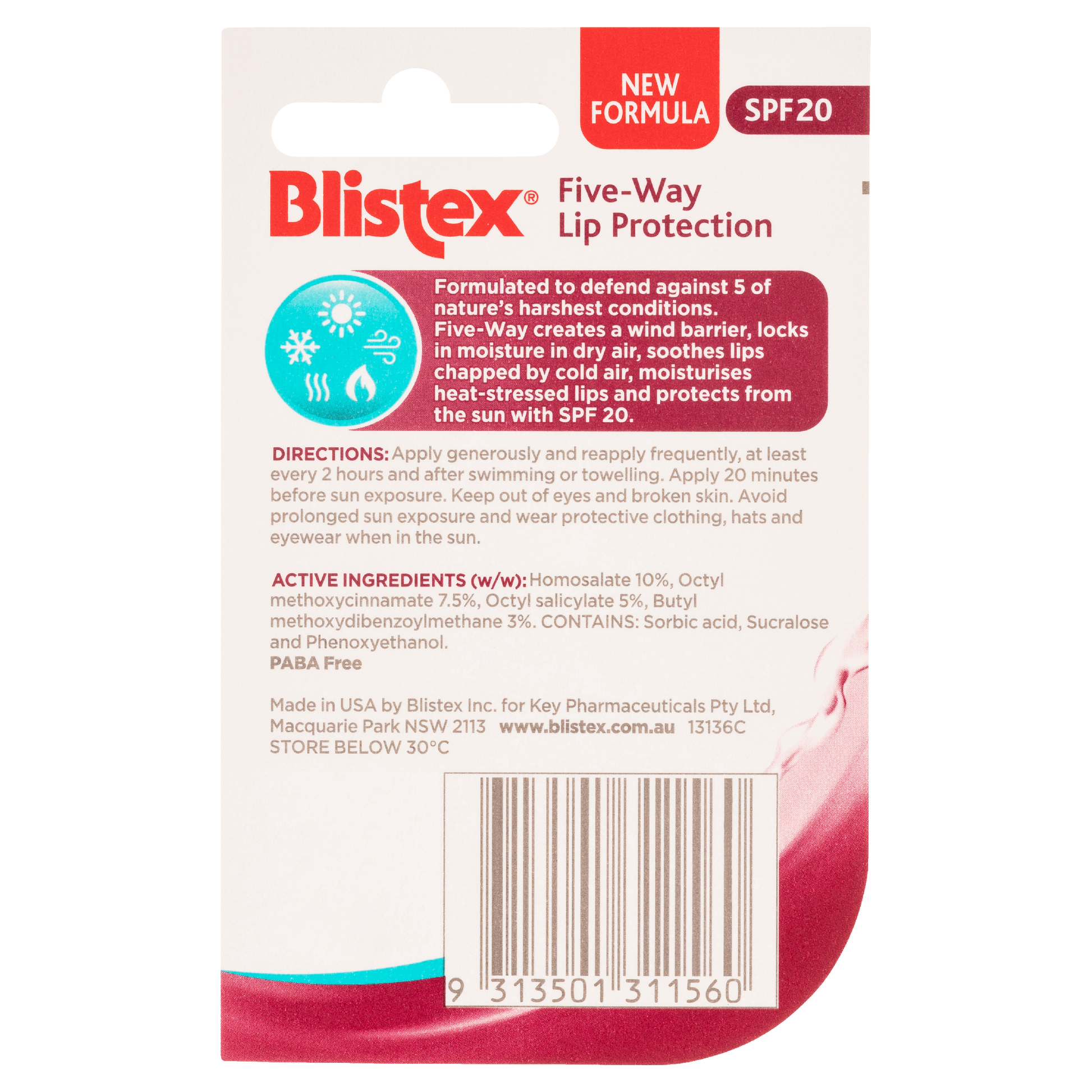 Five-Way creates a wind barrier, locks in moisture in dry air, soothes lips chapped by cold air, moisturises heat-stressed lips and protects from the sun. Broad spectrum medium sun protection SPF20.