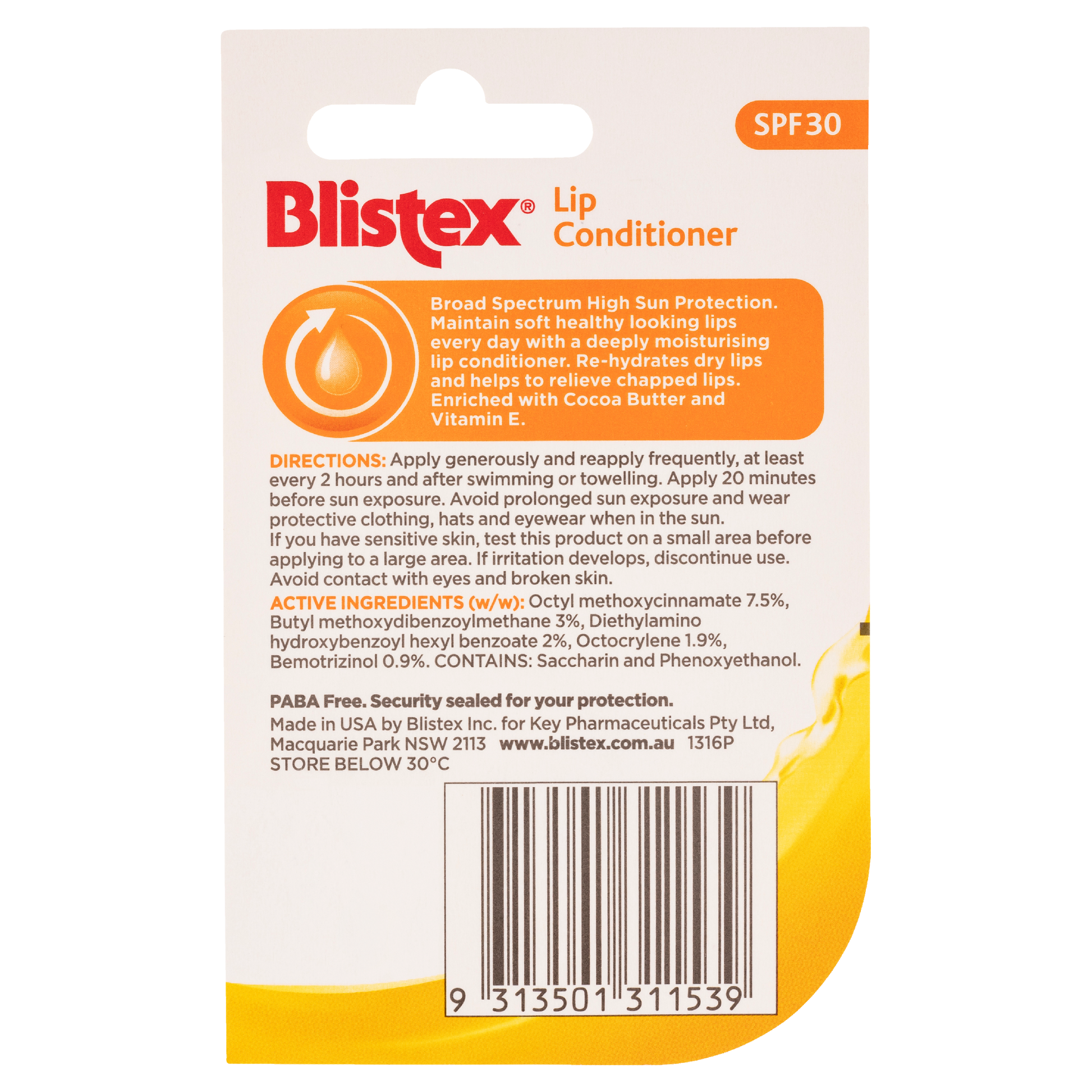 Blistex Lip Conditioner is deeply moisturising and helps to maintain soft, healthy looking lips everyday. Re-hydrate dry lips with the Cocoa Butter and Vitamin E enriched formula. Broad Spectrum High Sun Protection SPF 30.