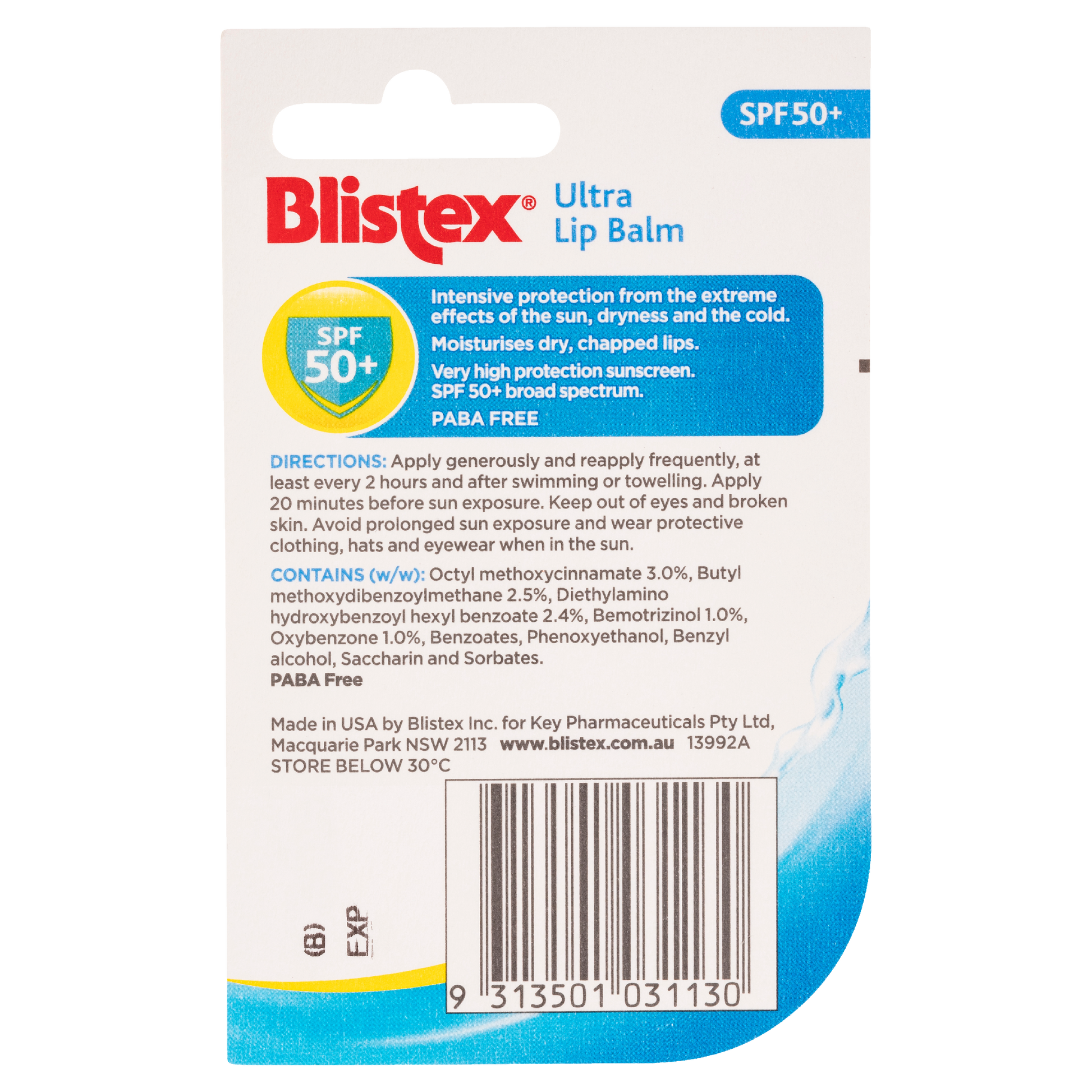Blistex Ultra Lip Balm SPF50 helps provide intensive protection from the effects of the sun, dryness & cold. It moisturises and protects dry and chapped lips..