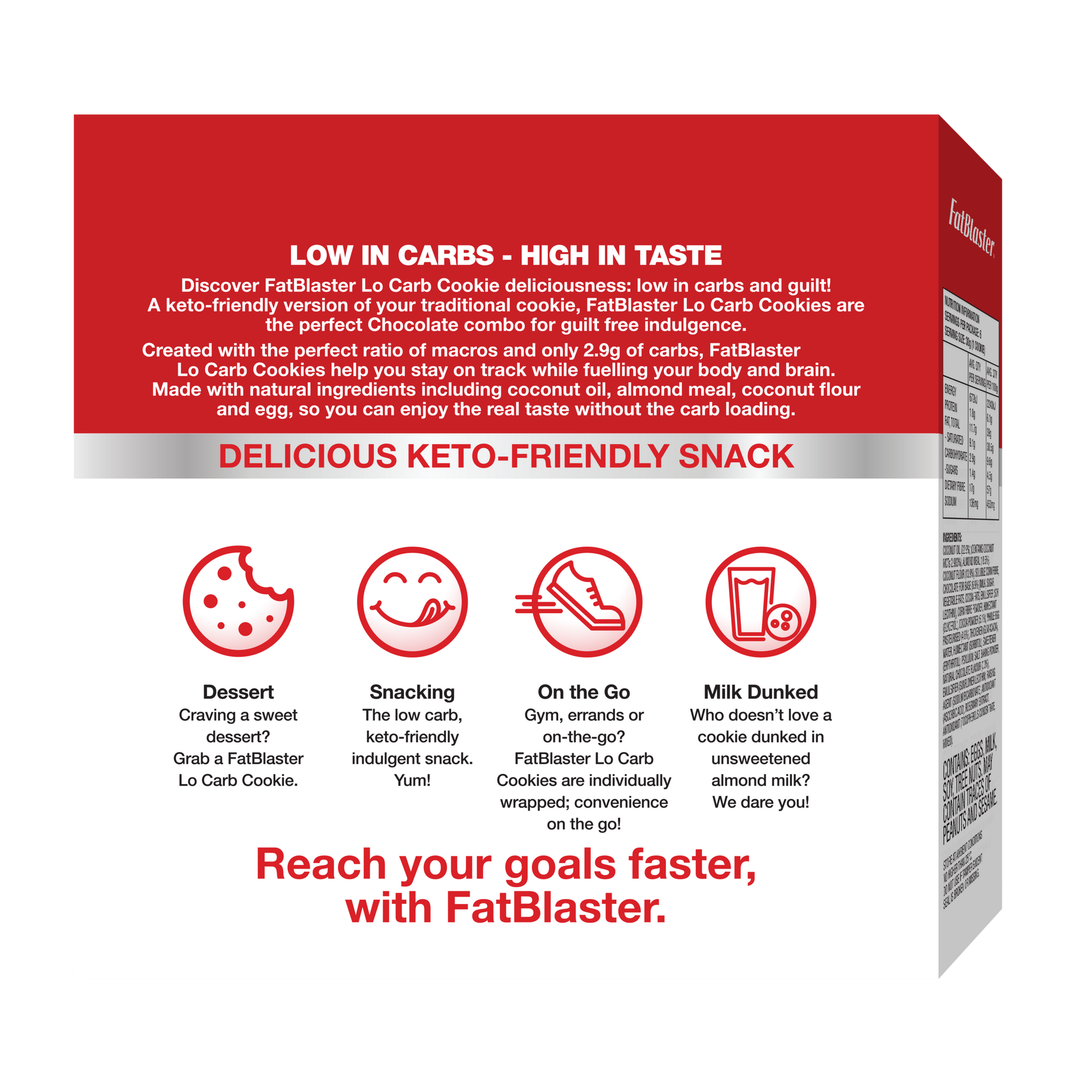 The FatBlaster Lo Carb Cookie is a keto-friendly version of your traditional cookie, FatBlaster Lo Carb Cookies are the perfect Chocolate combo for guilt free indulgence.