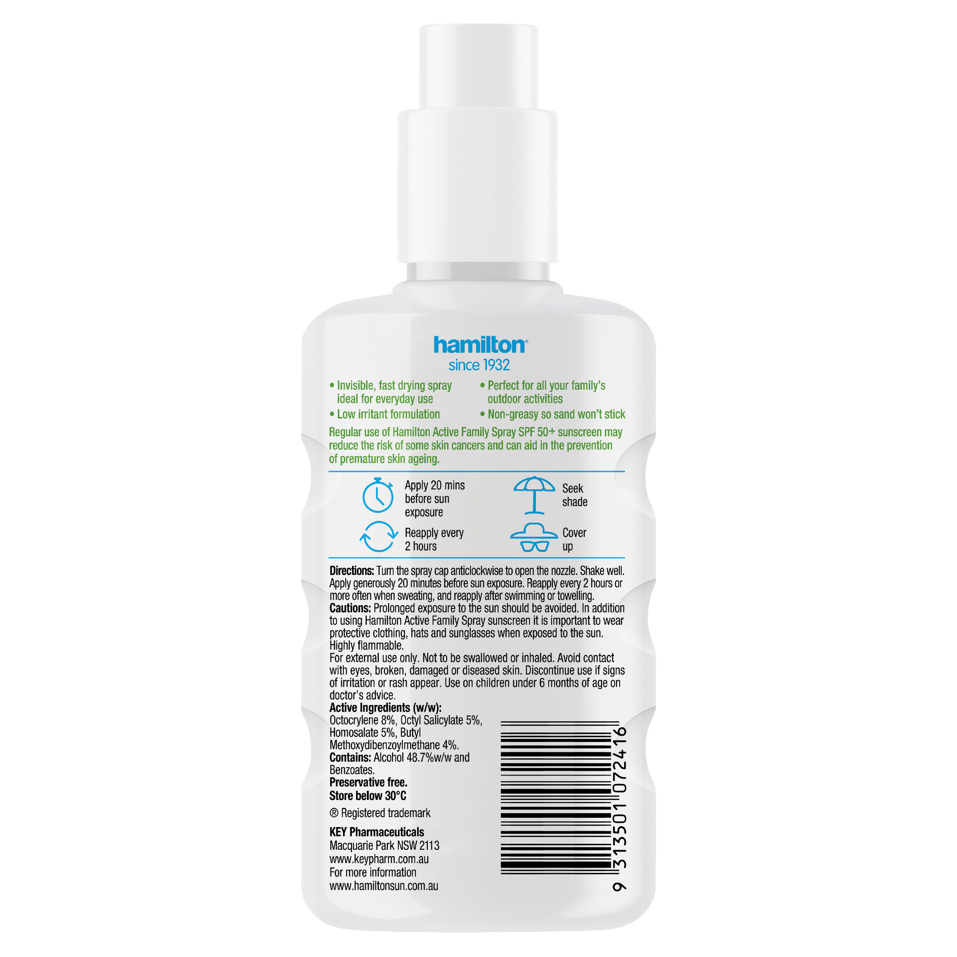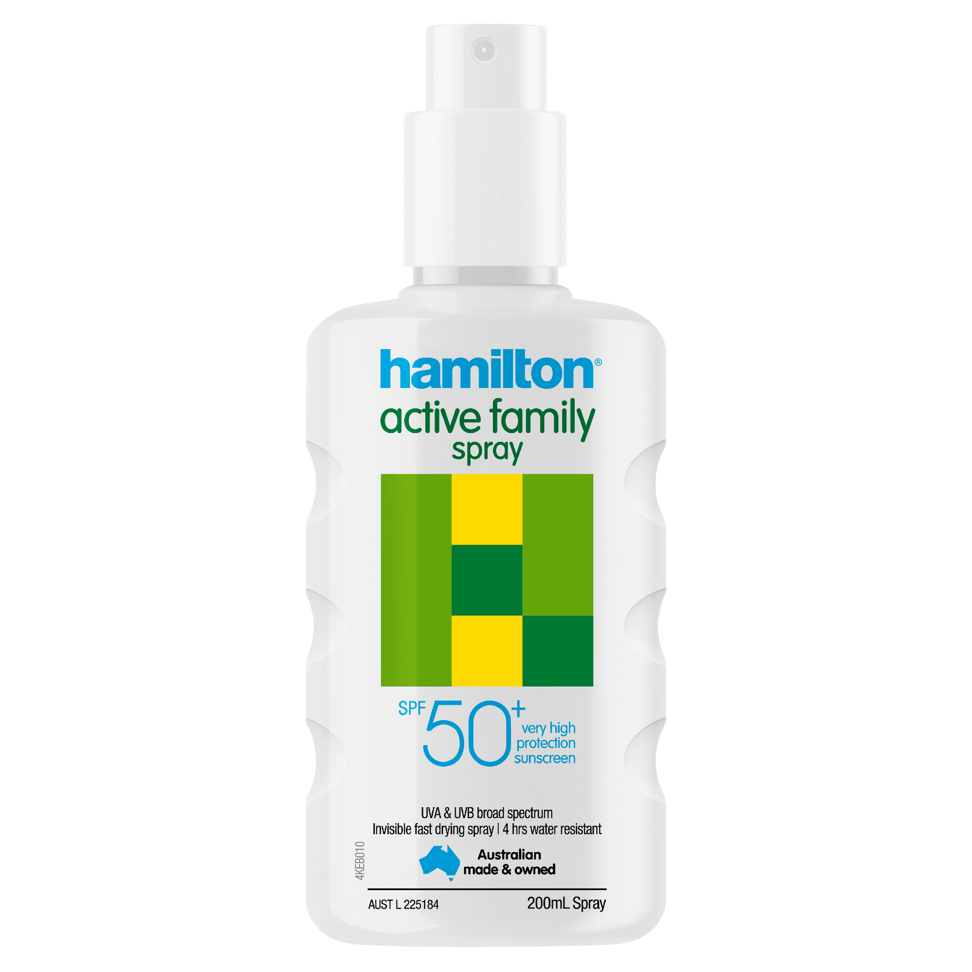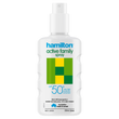 Hamilton Active Family SPF 50+ provides very high protection sunscreen with UVA & UVB broad spectrum. With a low irritant formulation, Active Family Spray is invisible, fast drying and non-greasy, with 4 hours water resistance.