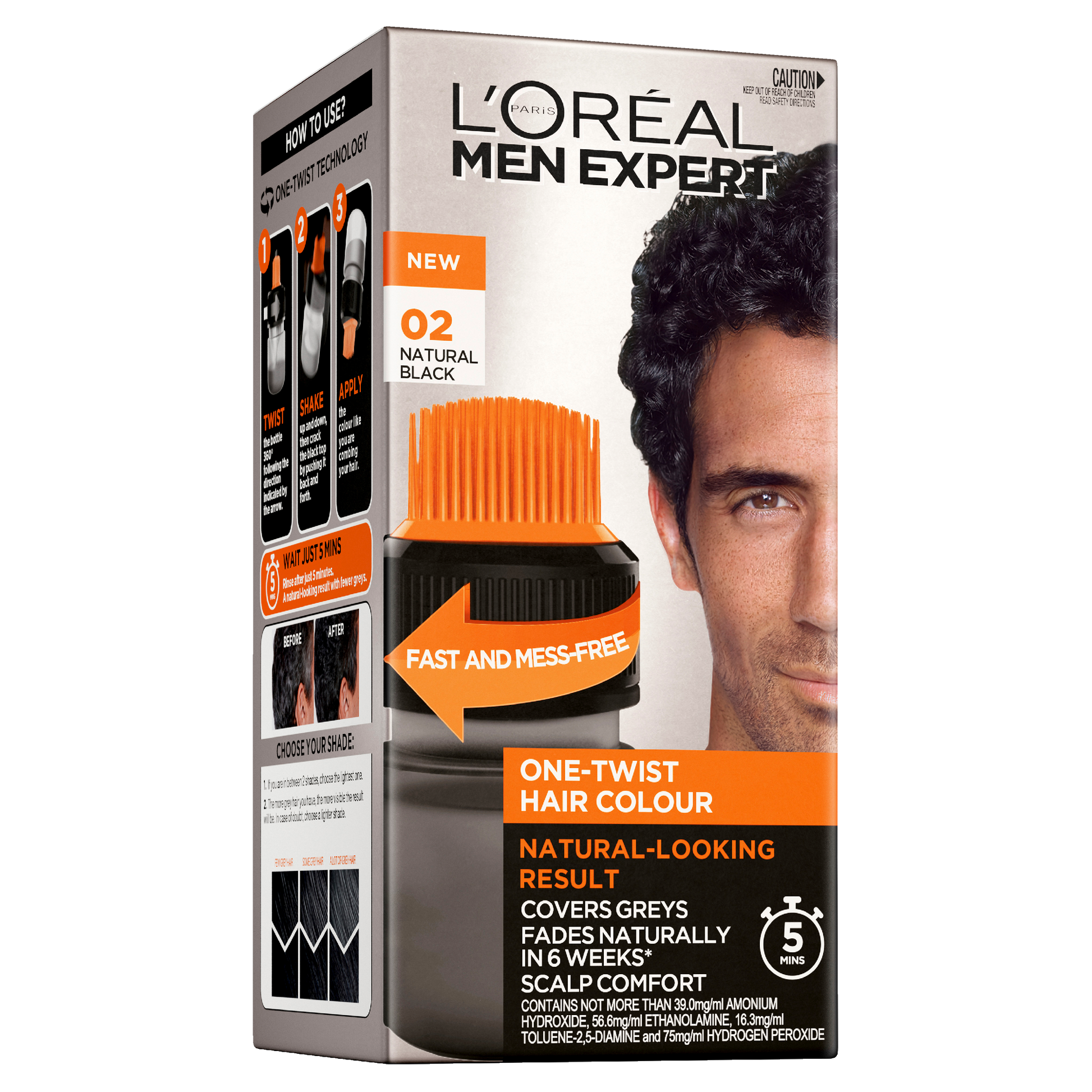 Specially developed for men's hair, this semi-permanent hair dye covers grey hair in just 5 minutes: easy and mess-free, our innovative ONE-TWIST technology works in just 5 minutes for a natural looking result that perfectly blends with your original hair colour. So natural, that no one will know you coloured your hair.