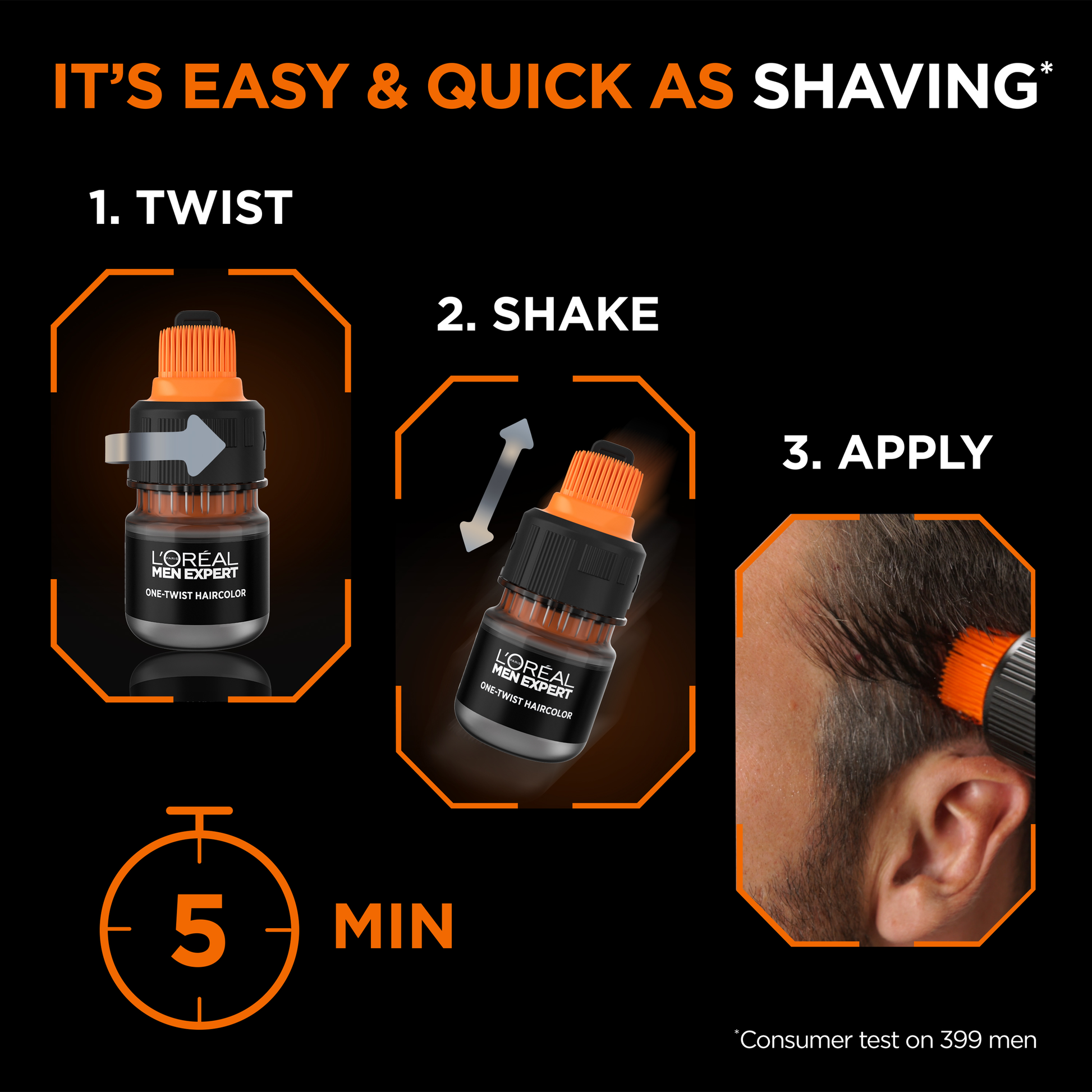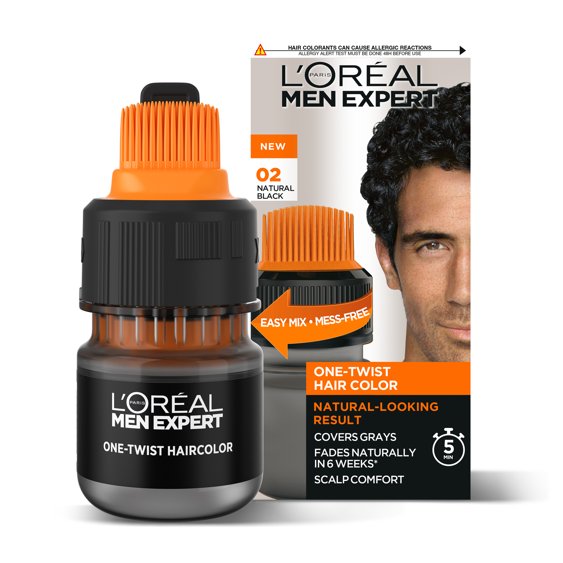 Get a natural looking hair result and cover grey hair in just 5 minutes with the easiest semi-permanent hair colour for men, the L'Oréal Paris Men Expert ONE-TWIST HAIR DYE: easy-mix, mess-free application.