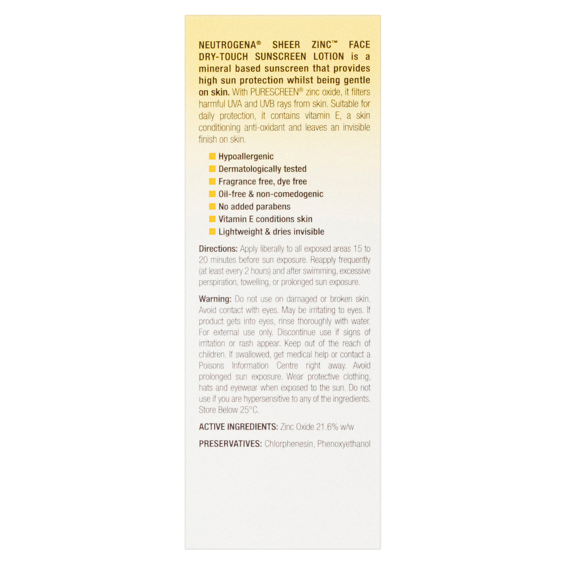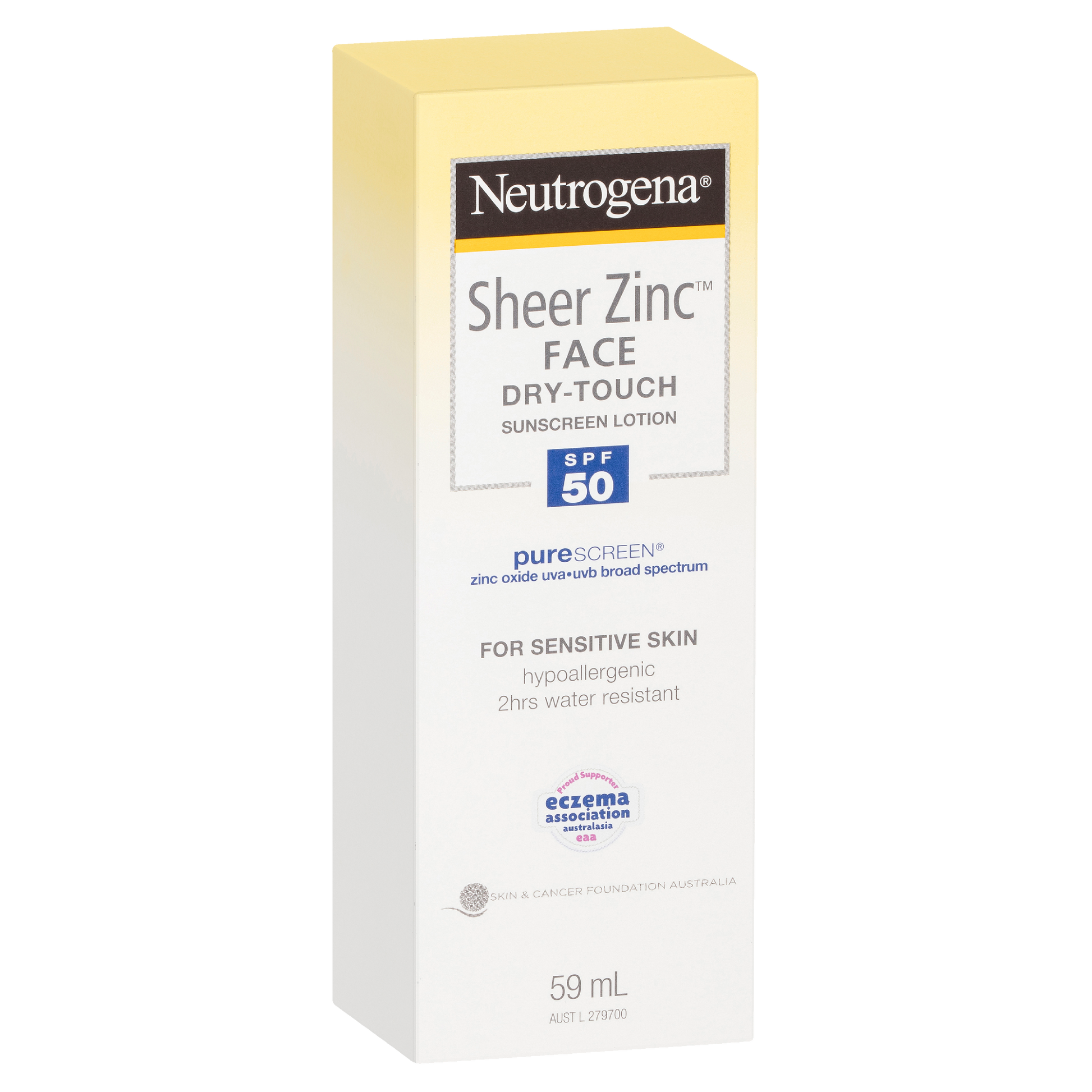 Neutrogena Sheer Zinc Face Dry-Touch Sunscreen Lotion SPF 50 for sensitive skin is hypoallergenic and up to 2 hours water resistant. The mineral based face sunscreen contains zinc oxide for physical broad spectrum sun protection.