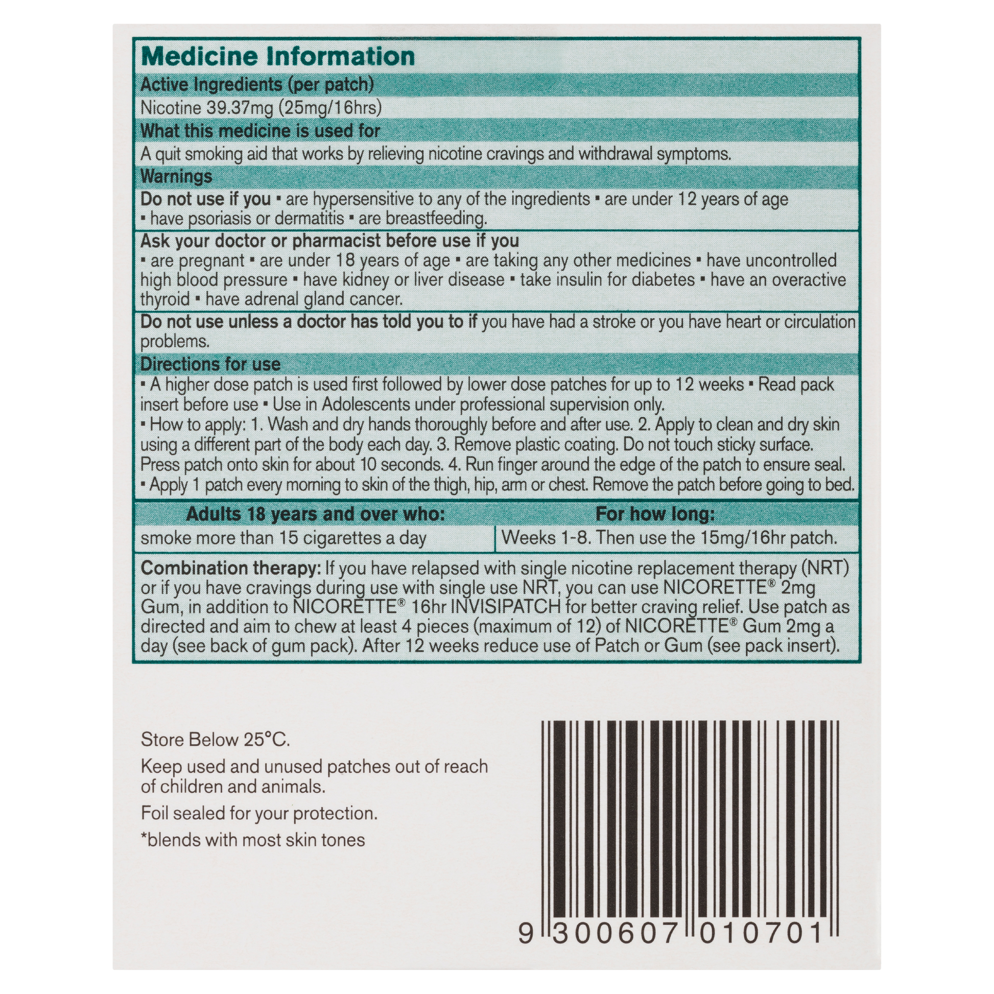 Nicorette 16hr Invisipatch Nicotine patch is a quit smoking aid.Nicorette patches work by relieving nicotine cravings and withdrawal symptoms.