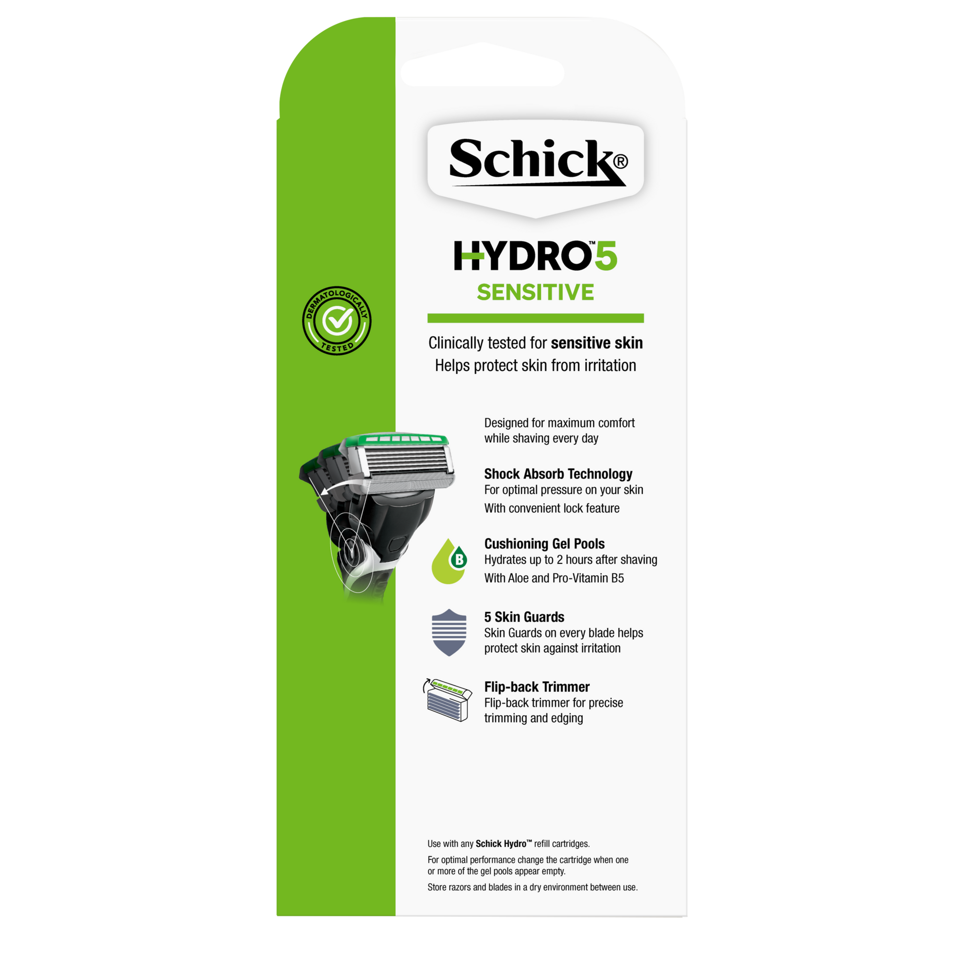 Schick Hydro 5 Sensitive Razor Kit helps protect your skin from irritation with its 7 hydrating gel pools that hydrates throughout each shave.