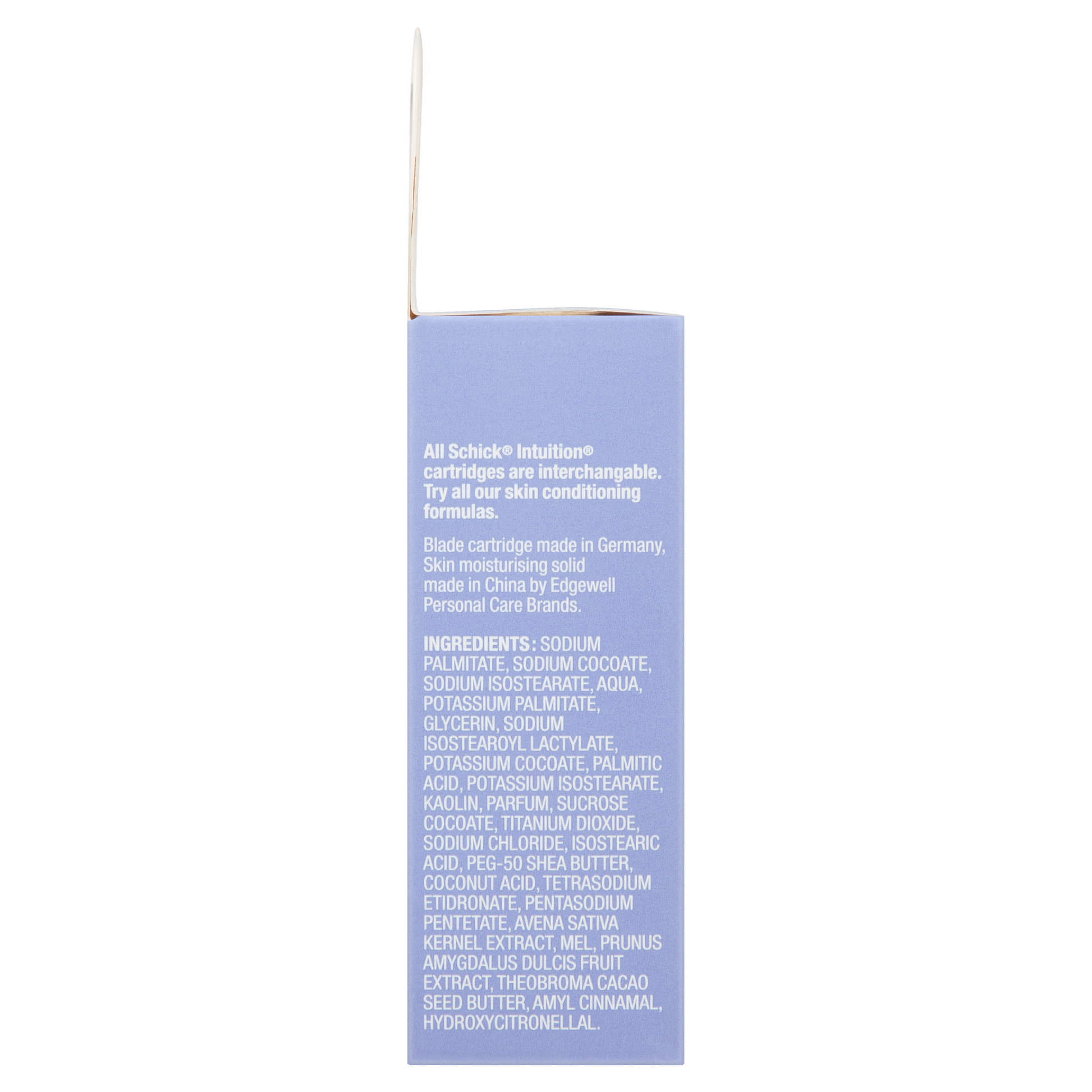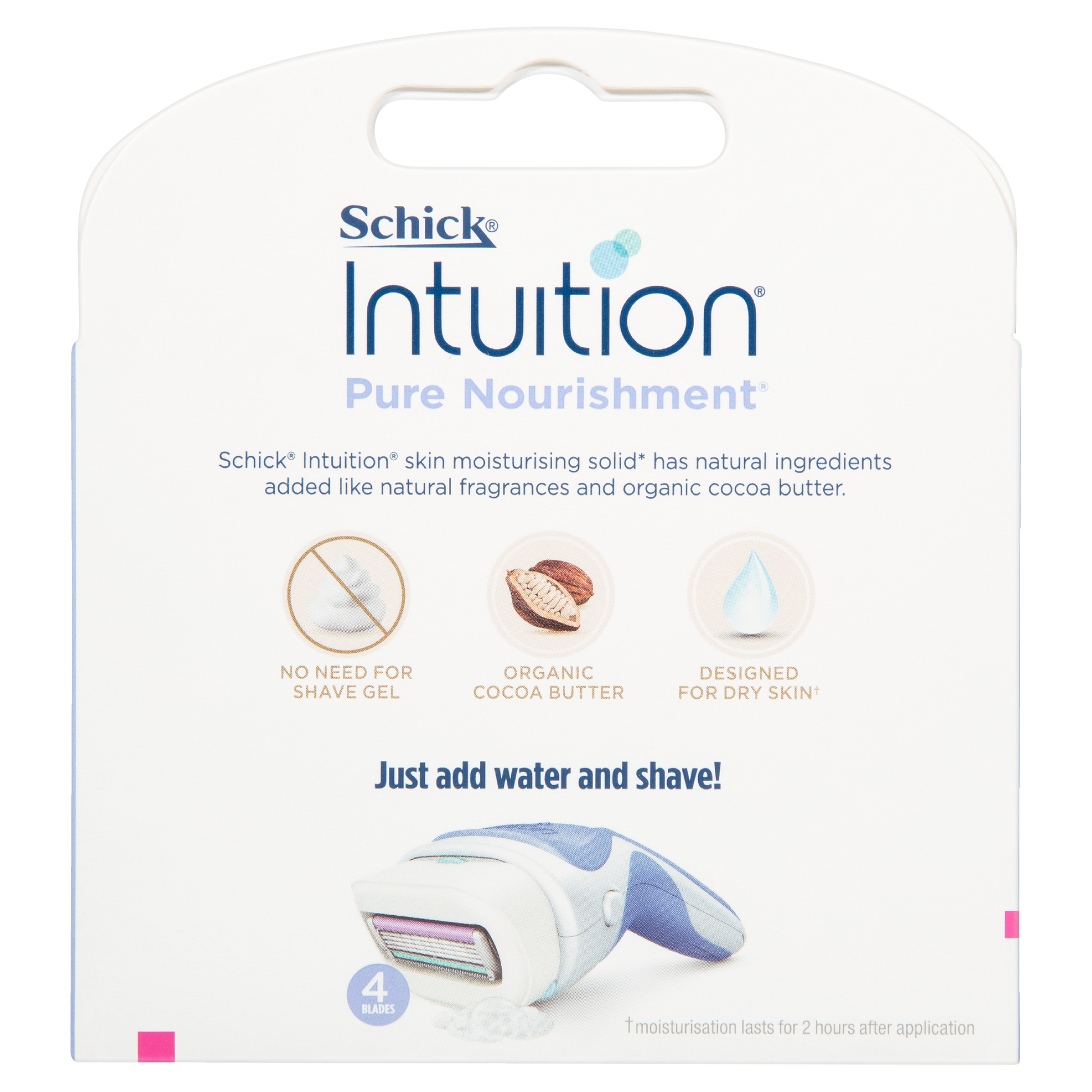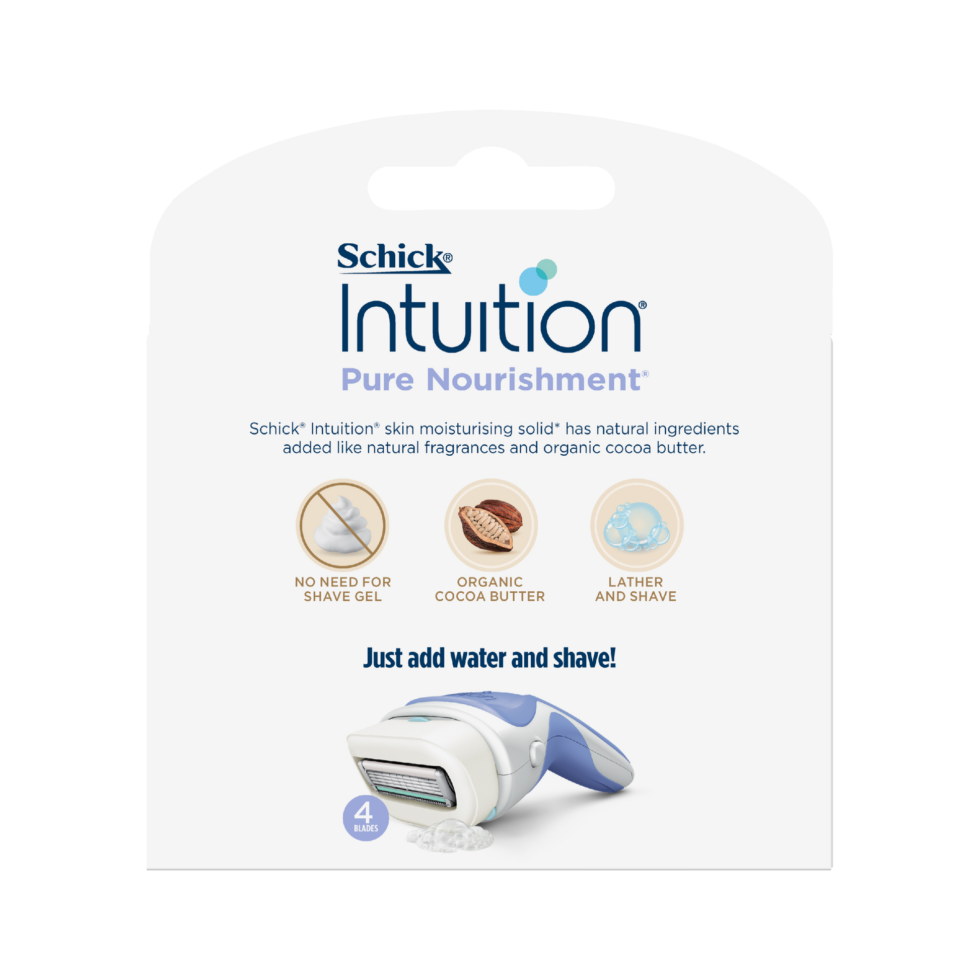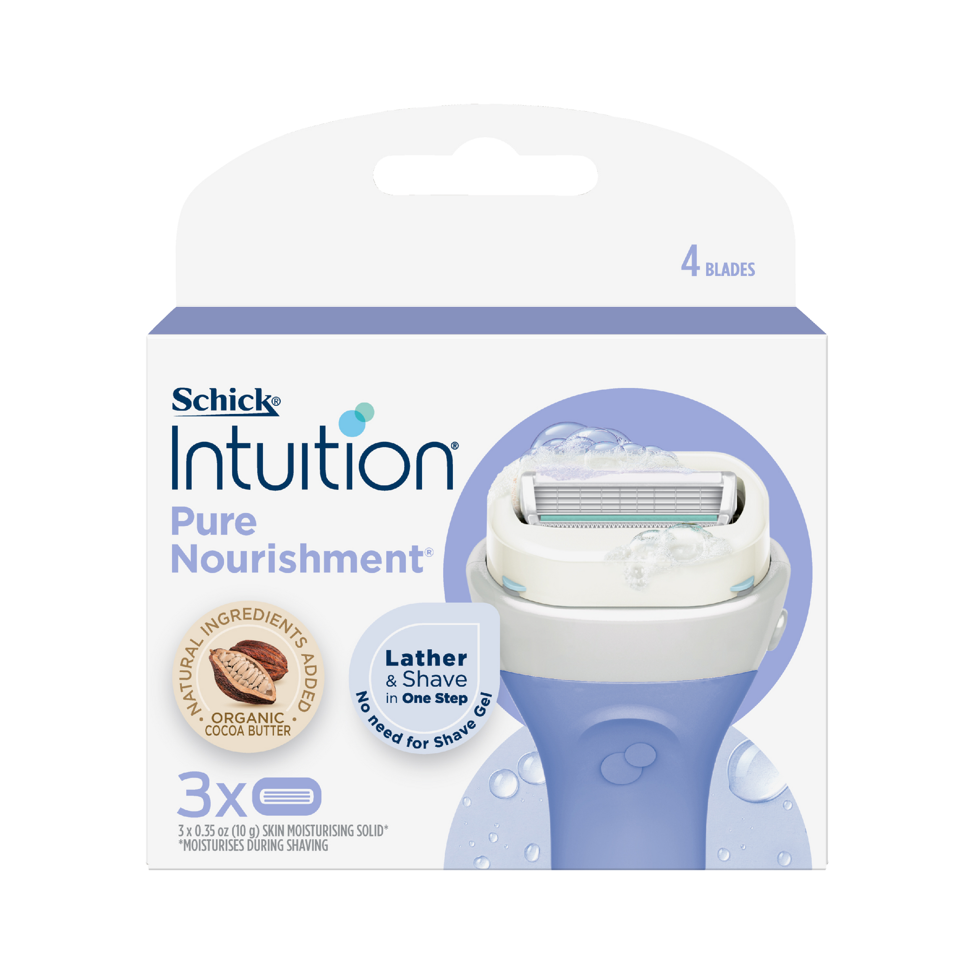 The Schick® Intuition® Pure Nourishment® razor with organic cocoa moisturises* and helps soften skin during shaving. The refill catridges feature a 4-blade pivoting head to glide smoothly along the contours of your legs and body.