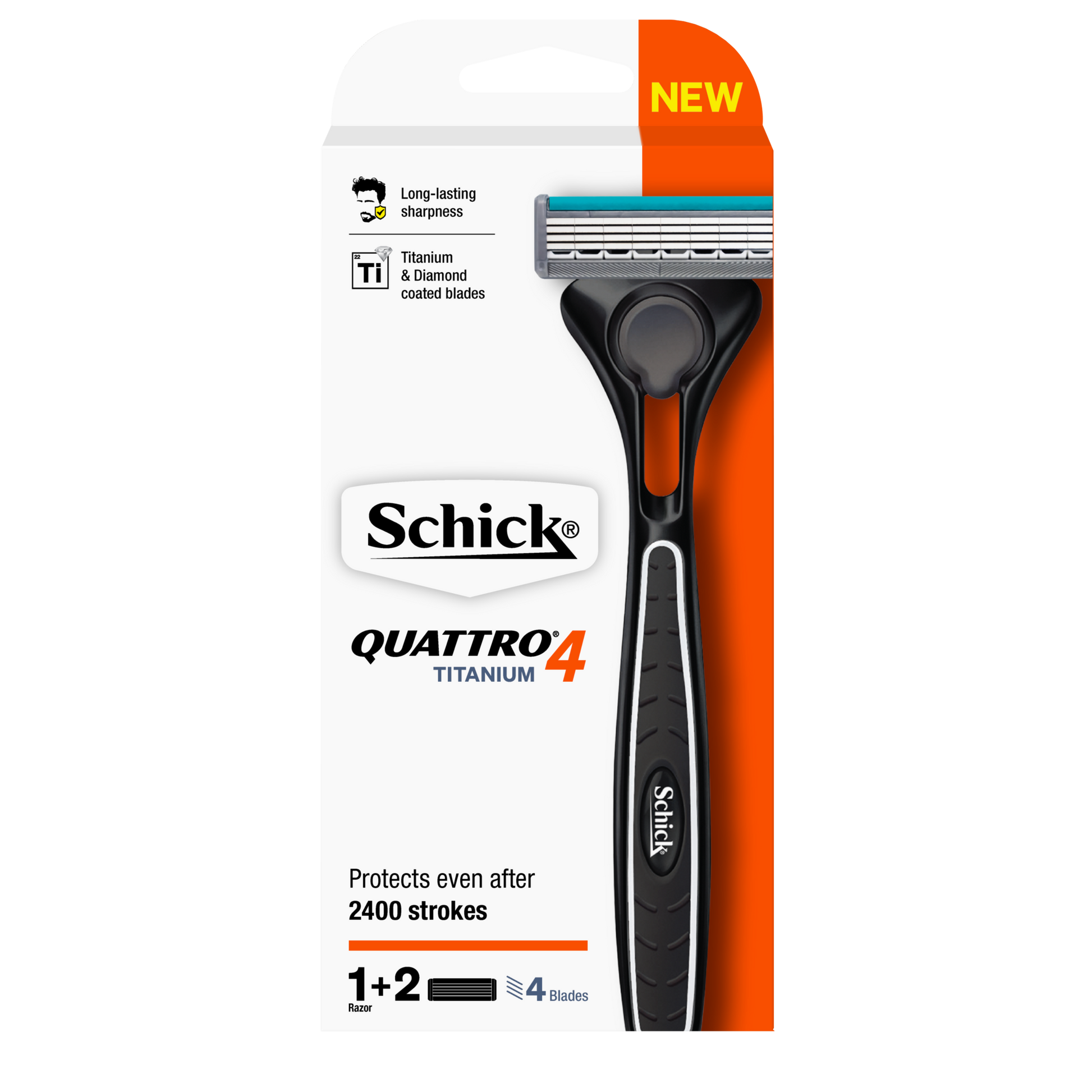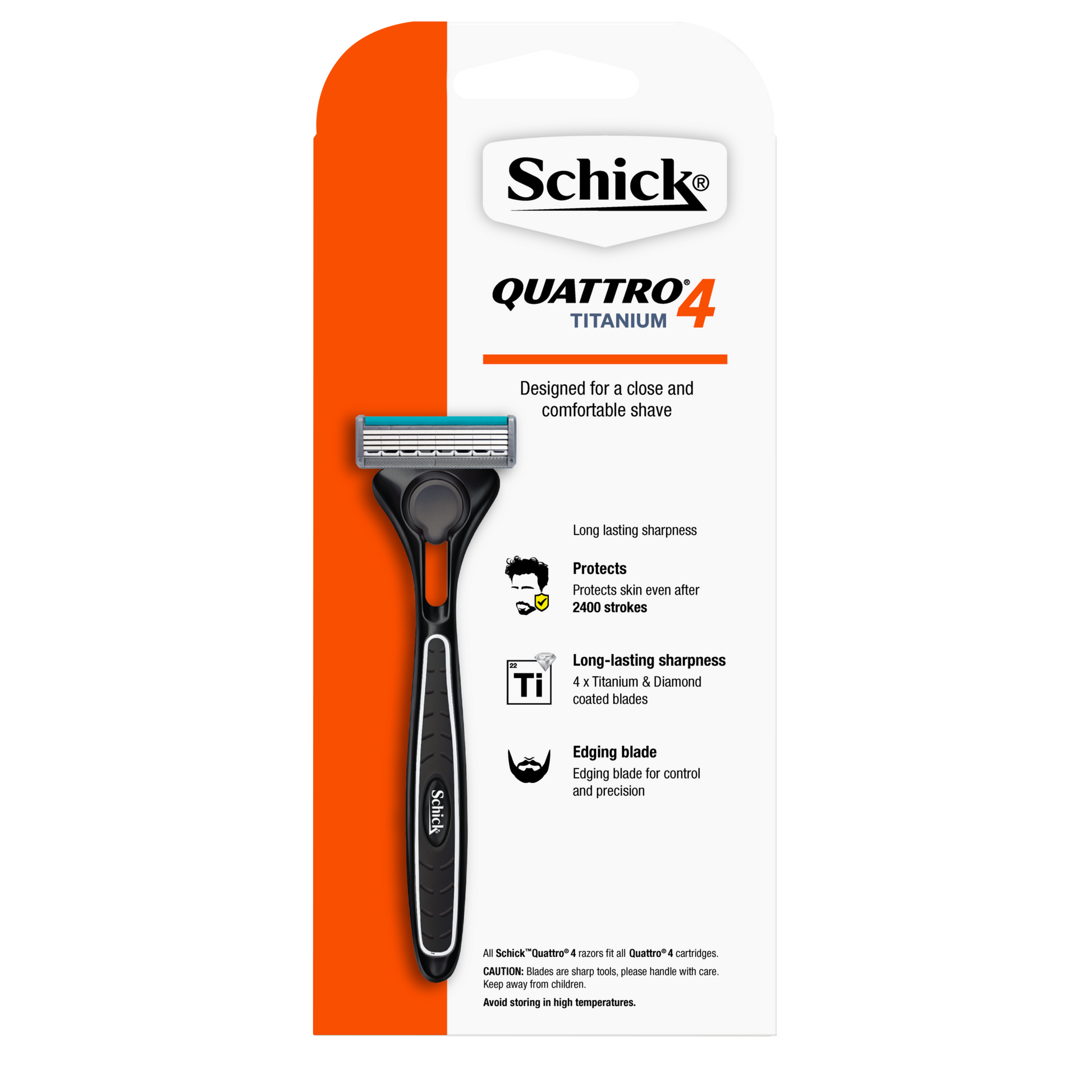 Schick® Quattro® Titanium 4 is a durable razor featuring 4 Titanium and Diamond coated blades that stay sharp to reduce irritation. An additional edging blade provides extra precision in hard-to-reach spaces, and an ergonomically designed handle gives added control. Plus, the great price makes it easy on your wallet.