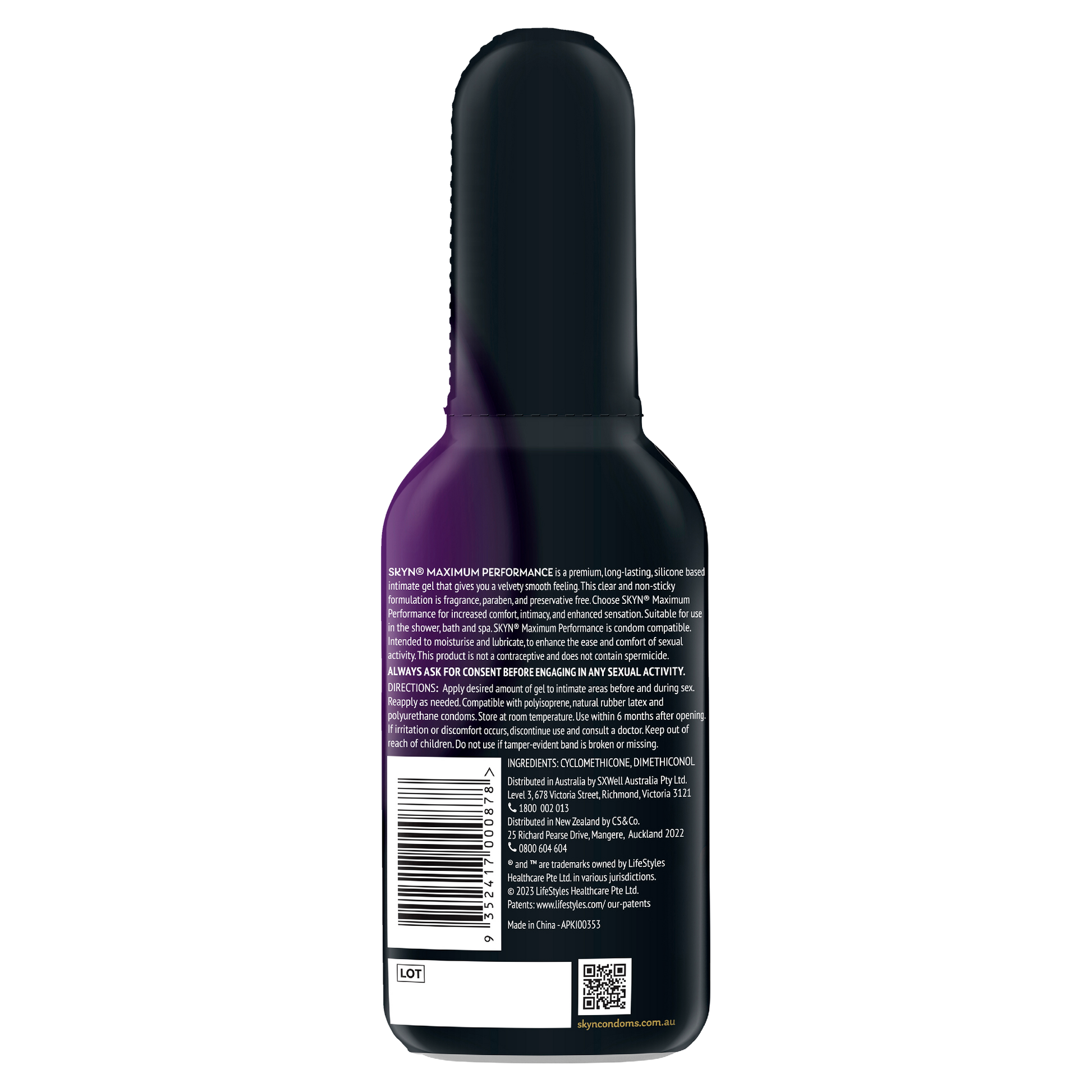 SKYN® Maximum Performance is a premium, long-lasting, silicone based intimate gel that gives you a velvety smooth feeling. This clear and non-sticky formulation is fragrance, paraben, and preservative free.