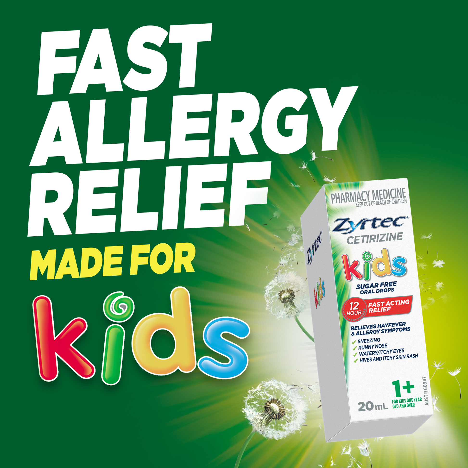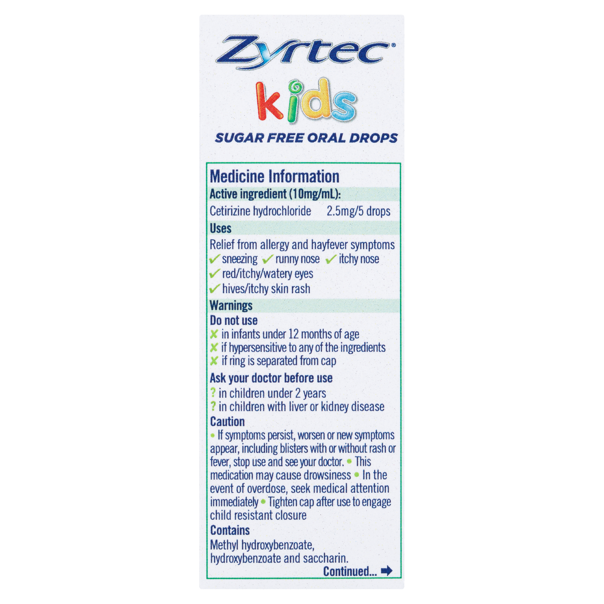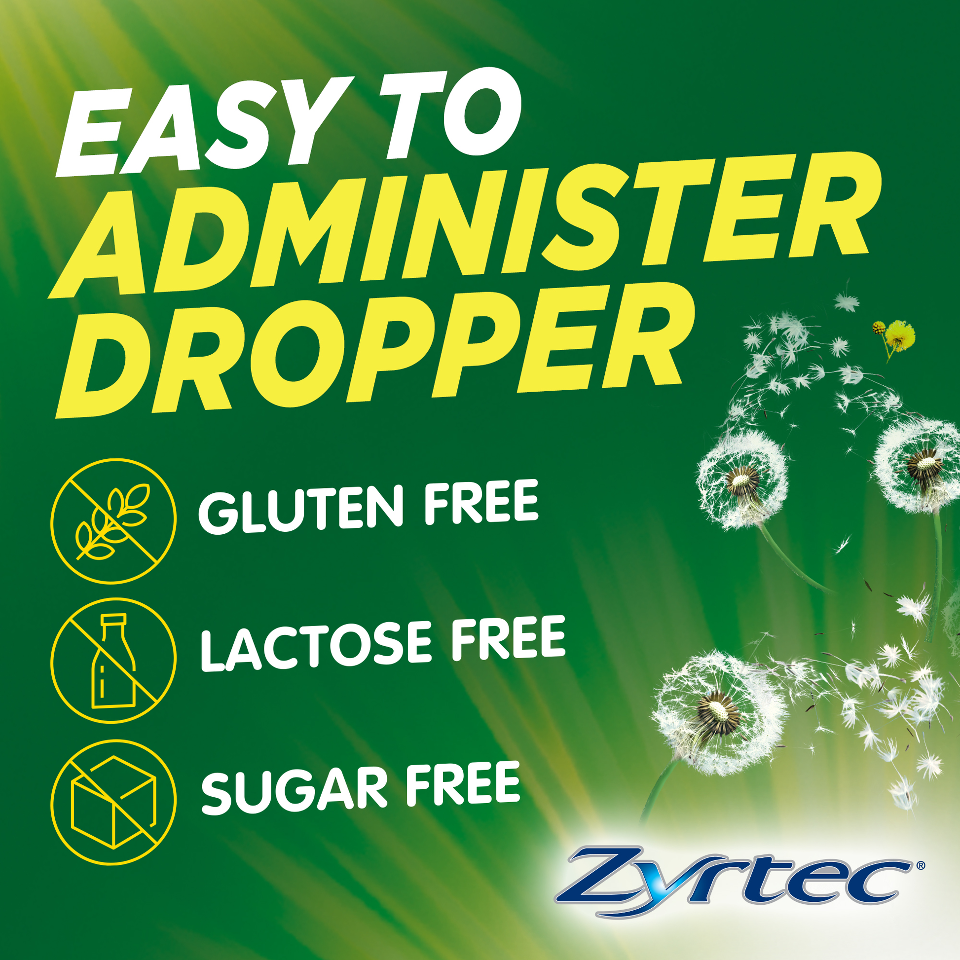 Zyrtec Kids Rapid Acting 12 hour Allergy & Hayfever Relief Antihistamine Oral Drops relieve hayfever & year around allergy symptoms, and are sugar, lactose and gluten free. Zyrtec Kids Oral Drops are suitable for children 1+.