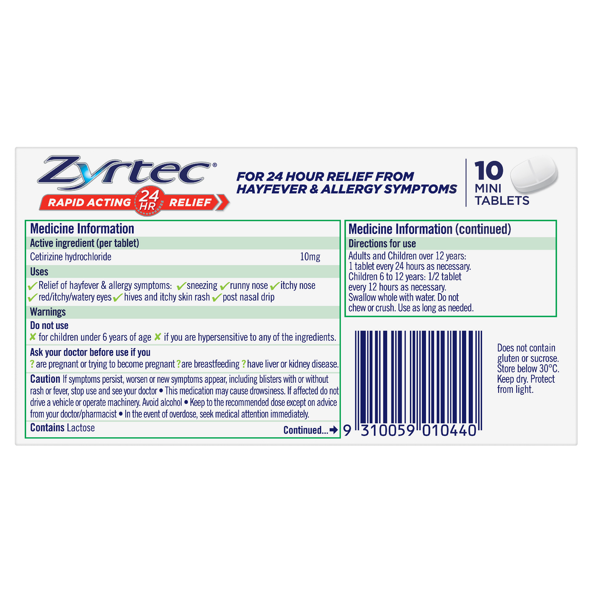Zyrtec Hayfever Allergy mini tablets contain cetirizine, which provides rapid acting 24 hour relief from the symptoms of hayfever allergies. No hayfever tablet works faster*. *Research conducted and funded by Zyrtec. The Onset of Action of Cetirizine Compared to Antihistamines in Allergic Rhinitis. March 2022. Available at Zyrtec.com.au/references.