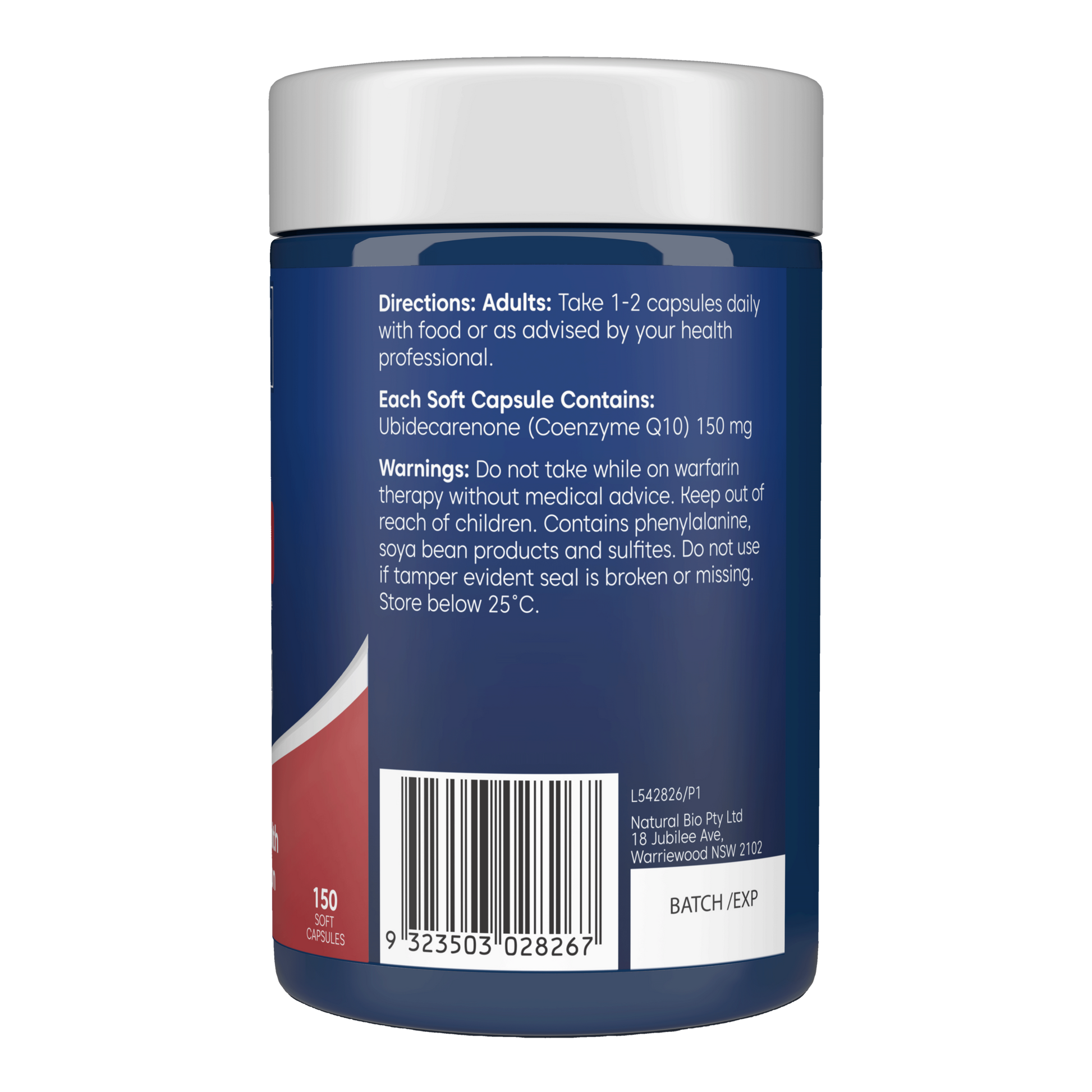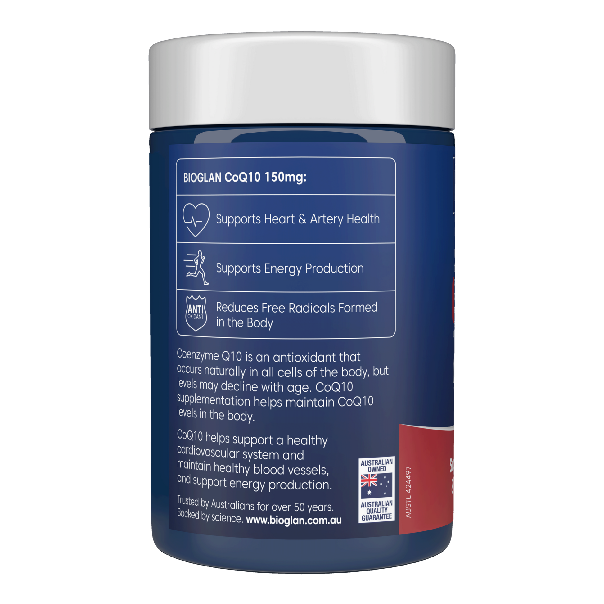 The formulation contains 150 mg of Coenzyme Q10, which helps support heart and artery health, maintain healthy blood vessels and support energy production. Bioglan CoQ10 150 mg also helps reduce free radical damage formed in the body.