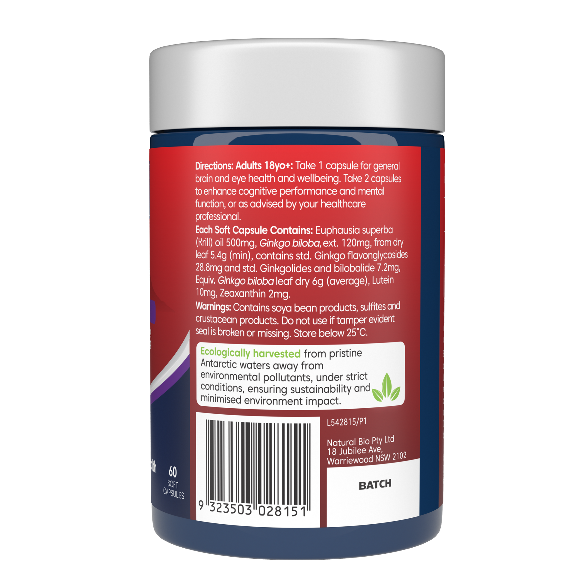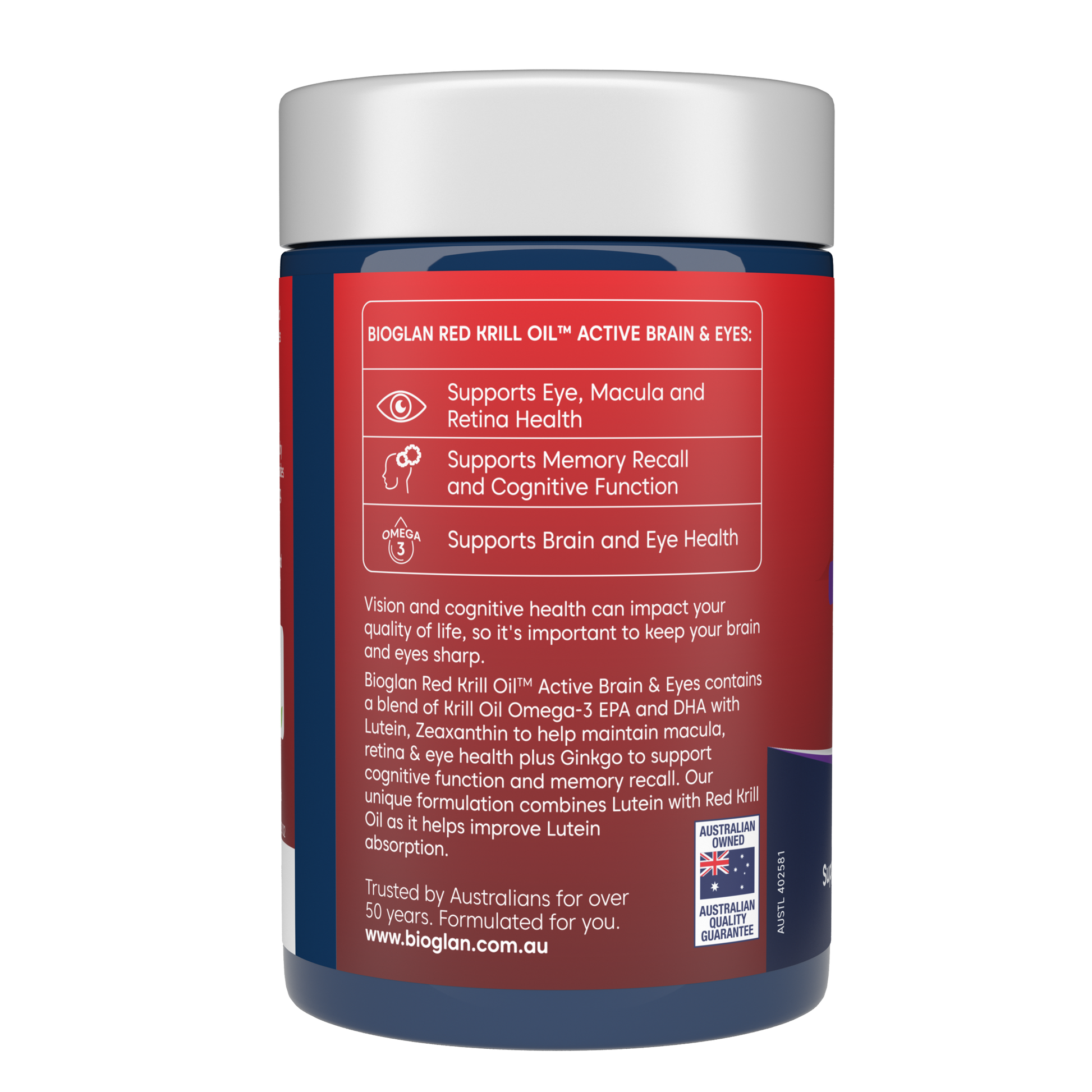 Bioglan Red Krill Oil™ Active Brain & Eyes contains a blend of Krill Oil Omega 3 EPA and DHA with Lutein, Zeaxanthin to help maintain macula, retina & eye health plus Ginkgo to support congnitive function and memory recall.