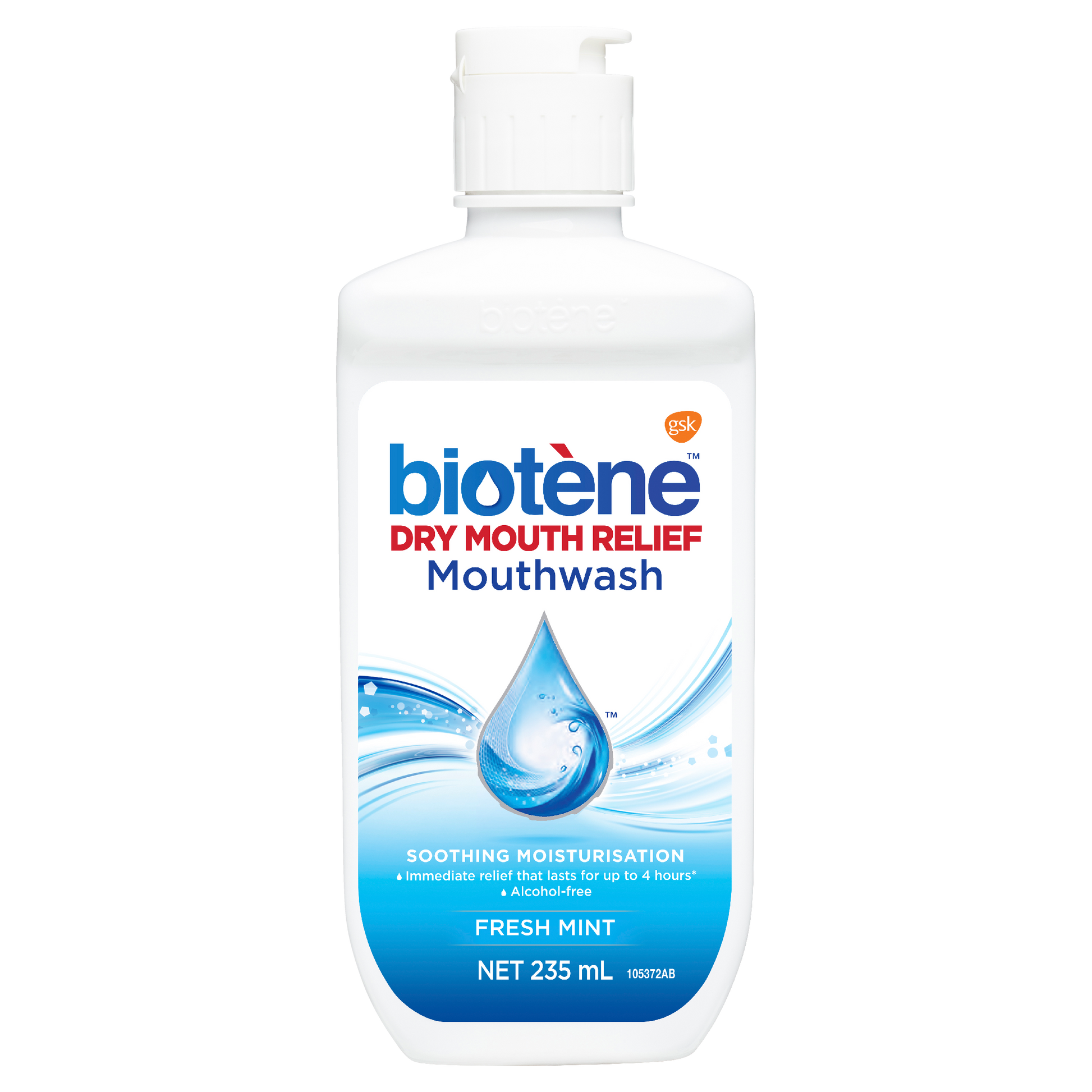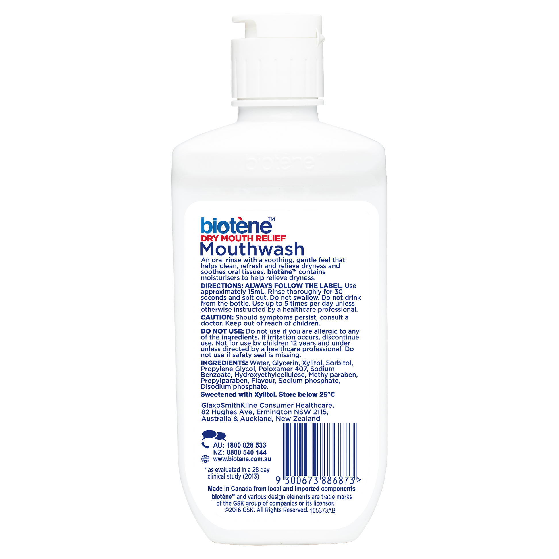 Biotene Dry Mouth Relief Mouthwash is an oral rinse with a soothing, gentle feel that helps clean, refresh, relieve the feeling of a dry mouth, and soothes oral tissues. Biotene contains moisturisers to help relieve mouth dryness. Biotene Dry Mouth Relief Mouthwash is specially formulated to provide immediate relief from the feeling of a dry mouth that lasts for up to 4 hours while it freshens your breath.
