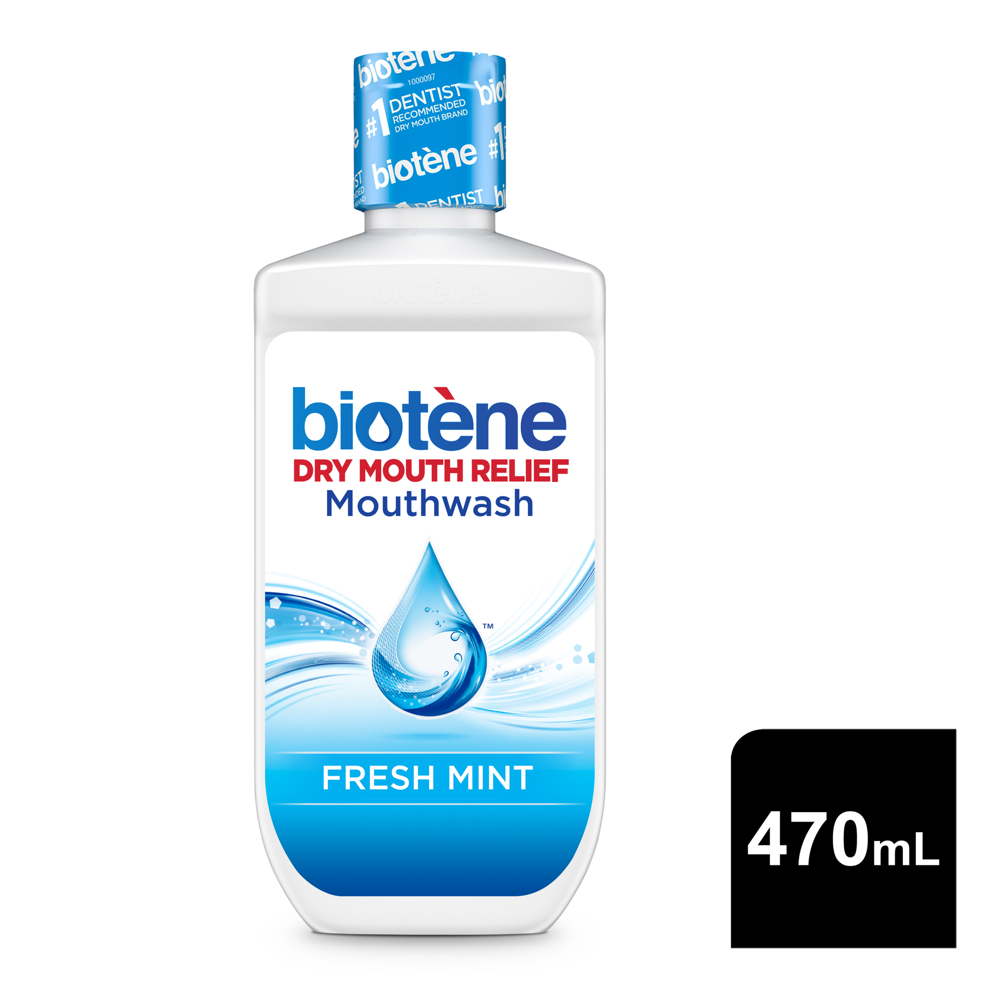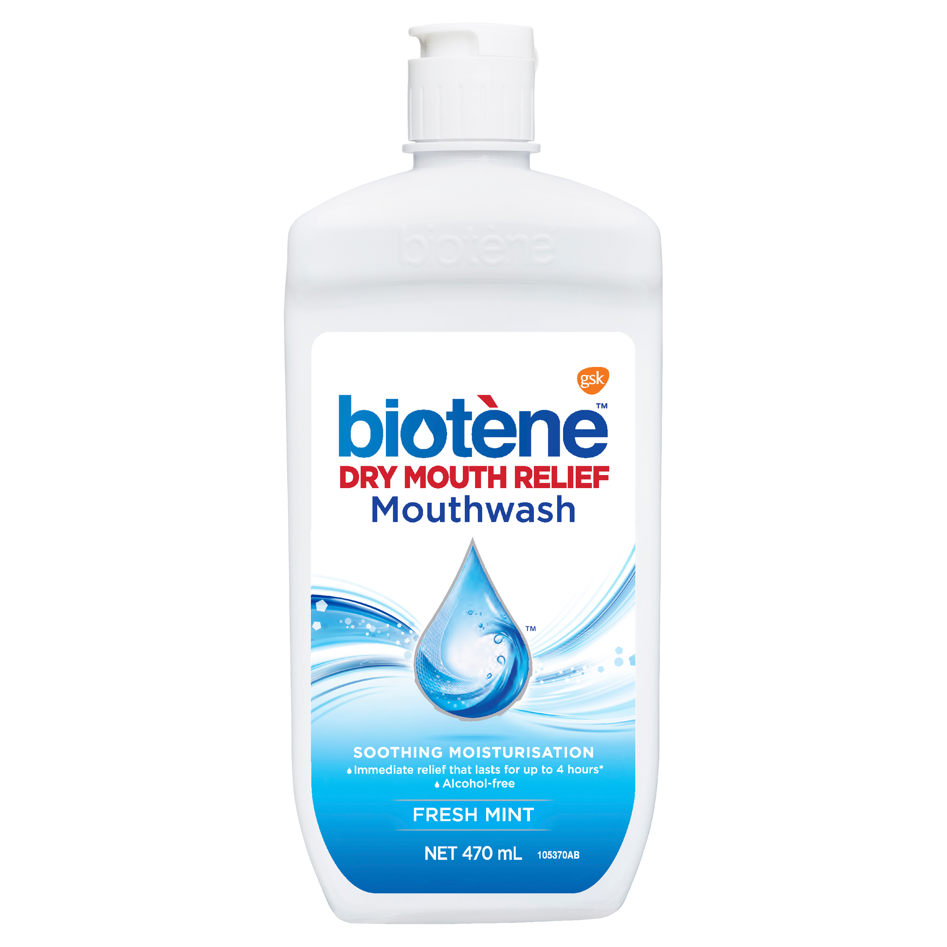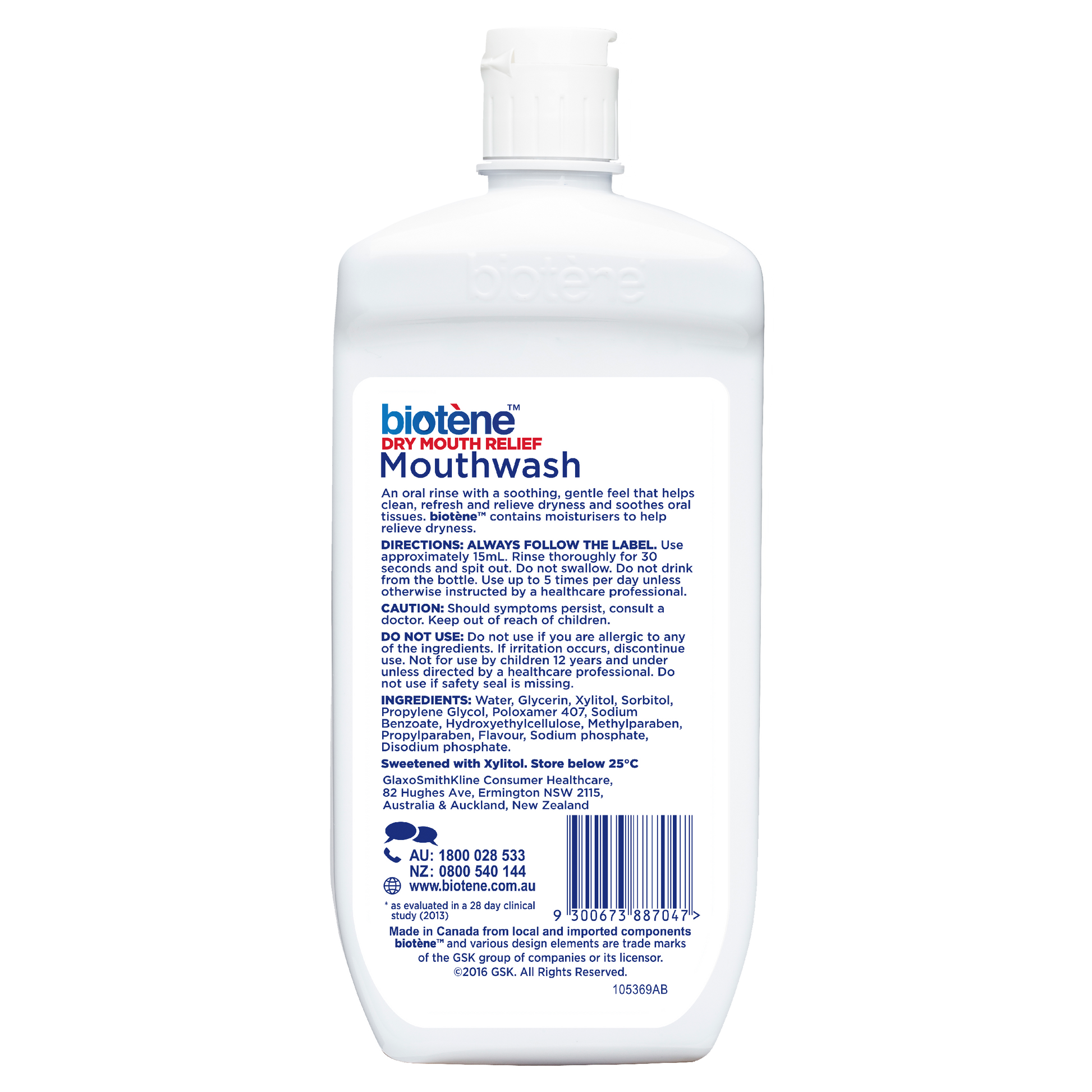 Biotene Dry Mouth Relief Mouthwash is an oral rinse with a soothing, gentle feel that helps clean, refresh, relieves the feeling of a dry mouth and soothes oral tissues. Biotene contains moisturisers to help relieve mouth dryness. Biotene Dry Mouth Relief Mouthwash is specially formulated to provide immediate relief from the feeling of a dry mouth that lasts for up to 4 hours while it freshens your breath.