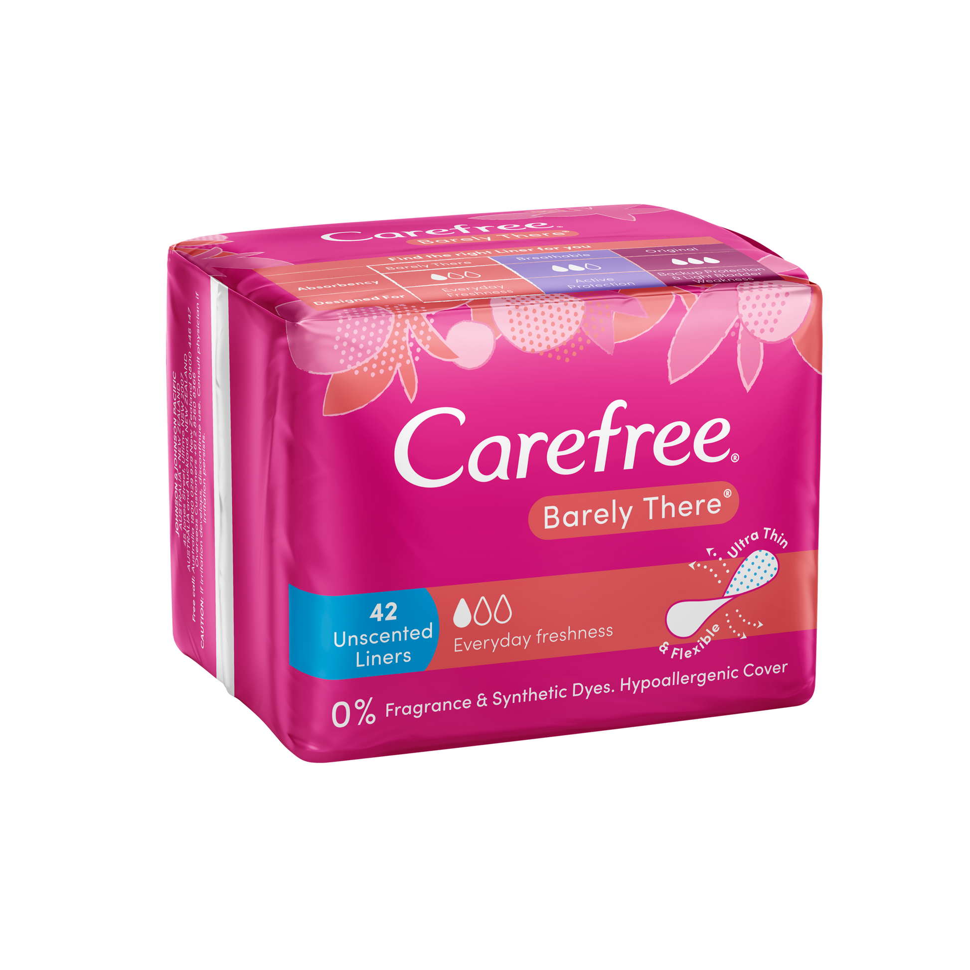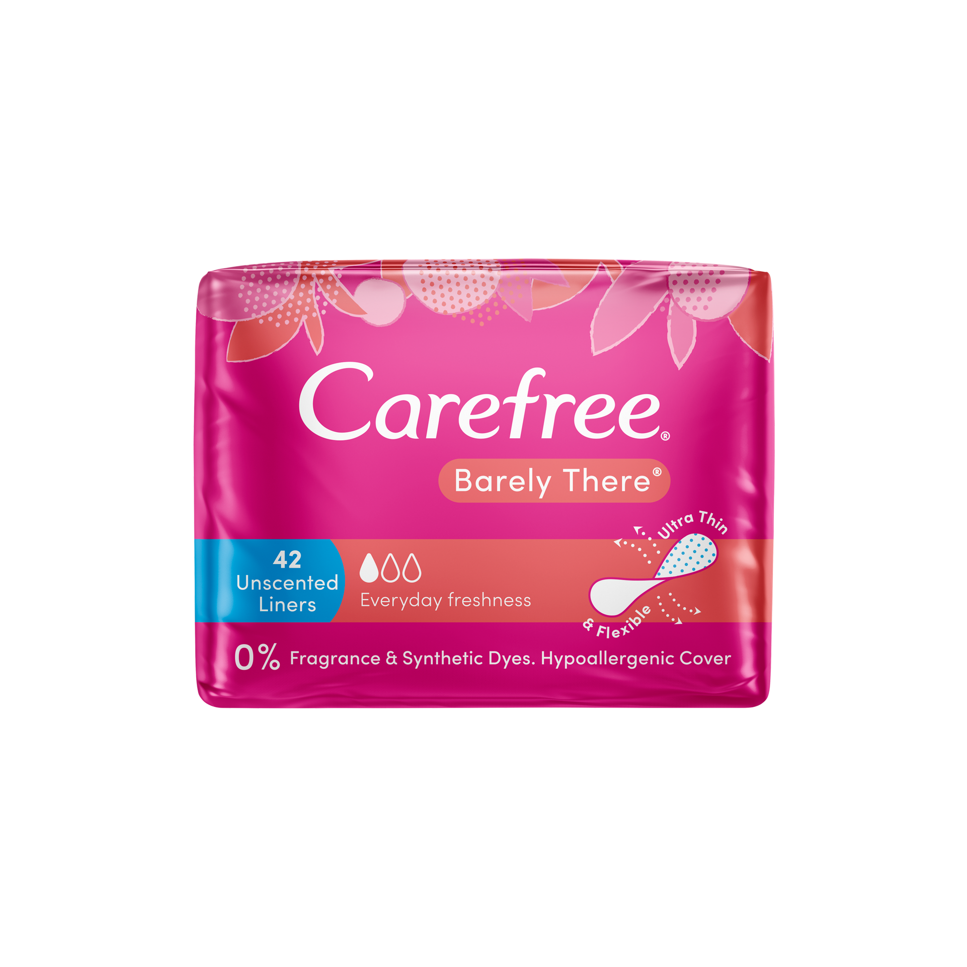 Carefree Barely There Unscented Panty Liners offer everyday freshness. These panty liners for discharge are breathable, soft, and comfortable, perfect for daily use. Ultra-thin and flexible means it's invisible and can fold like wings for g strings.