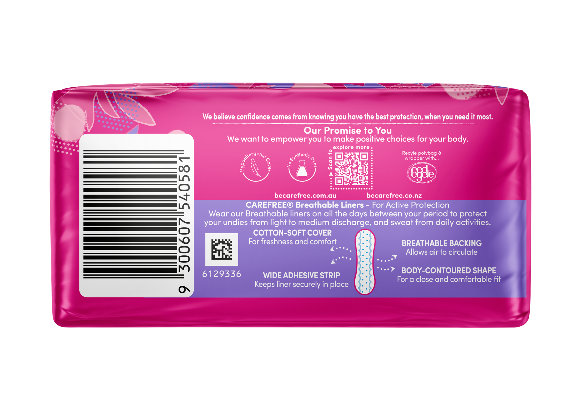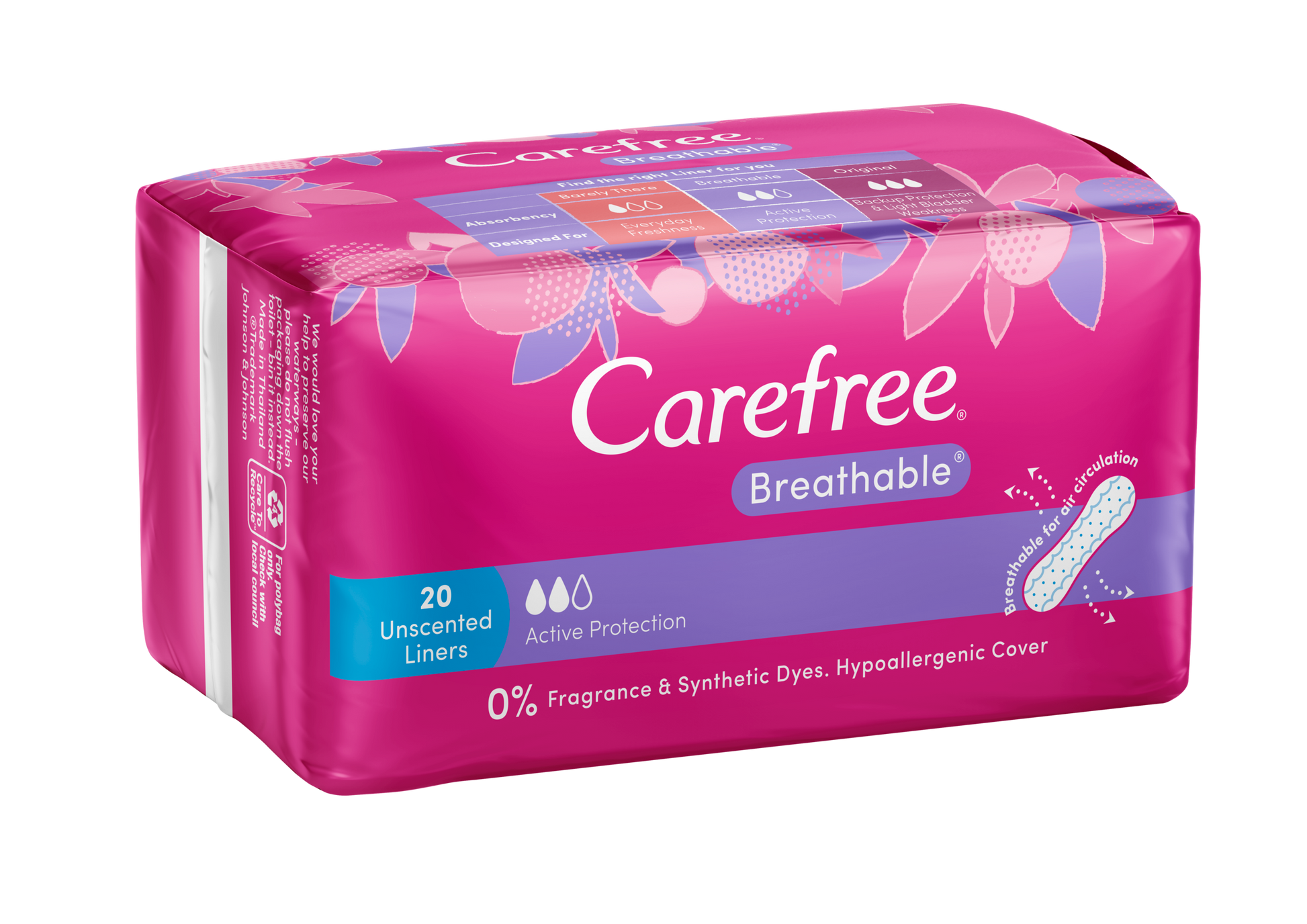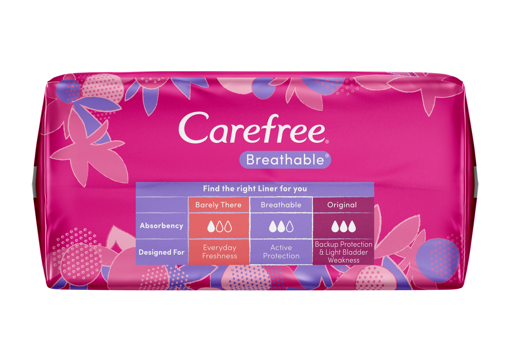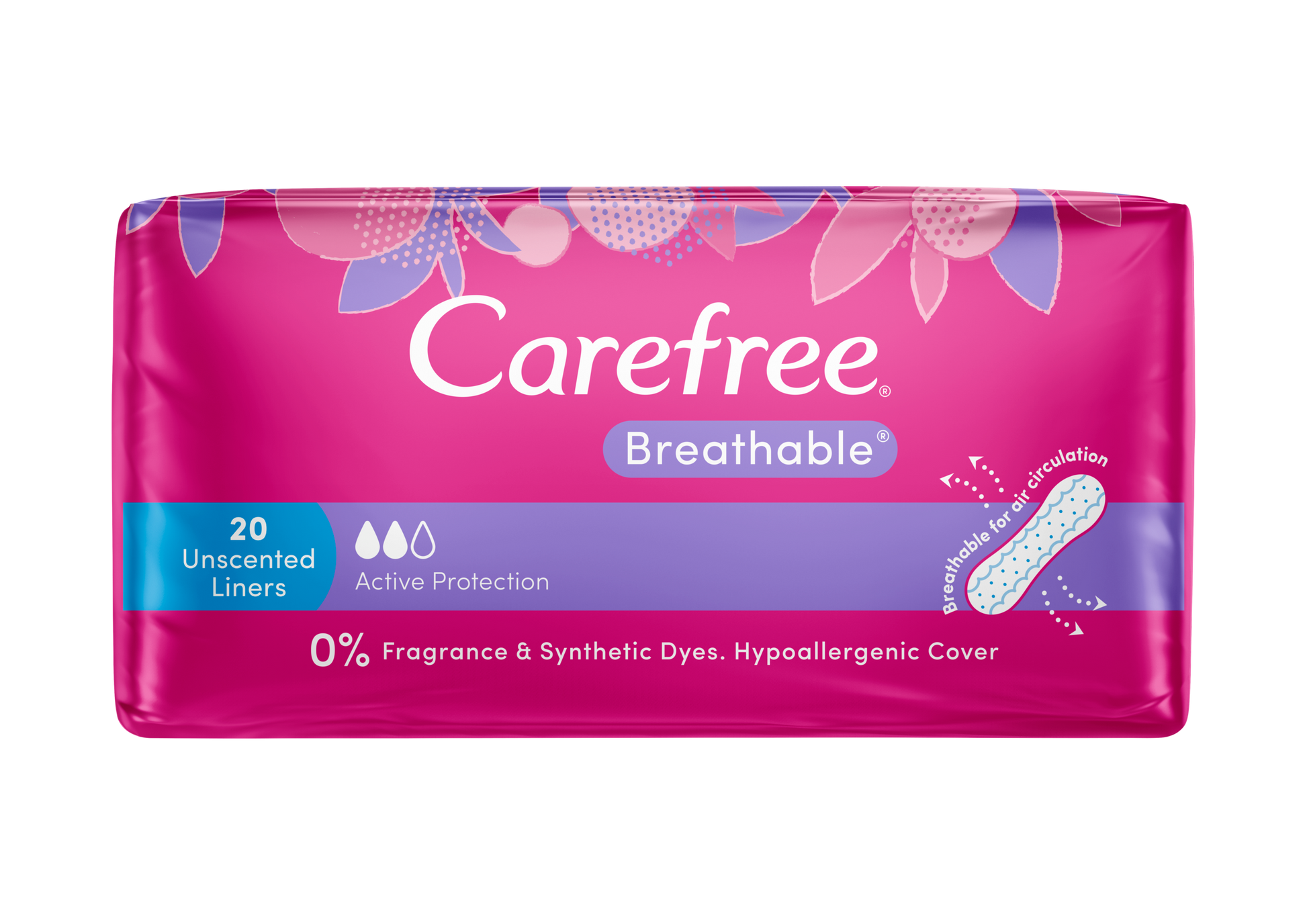 Carefree Breathable Unscented Liners have a body-contoured shape for a close and comfortable fit and allows air to circulate. Ideal for the days between your period for everyday freshness. Absorbent liner suitable for light discharge & sweat.