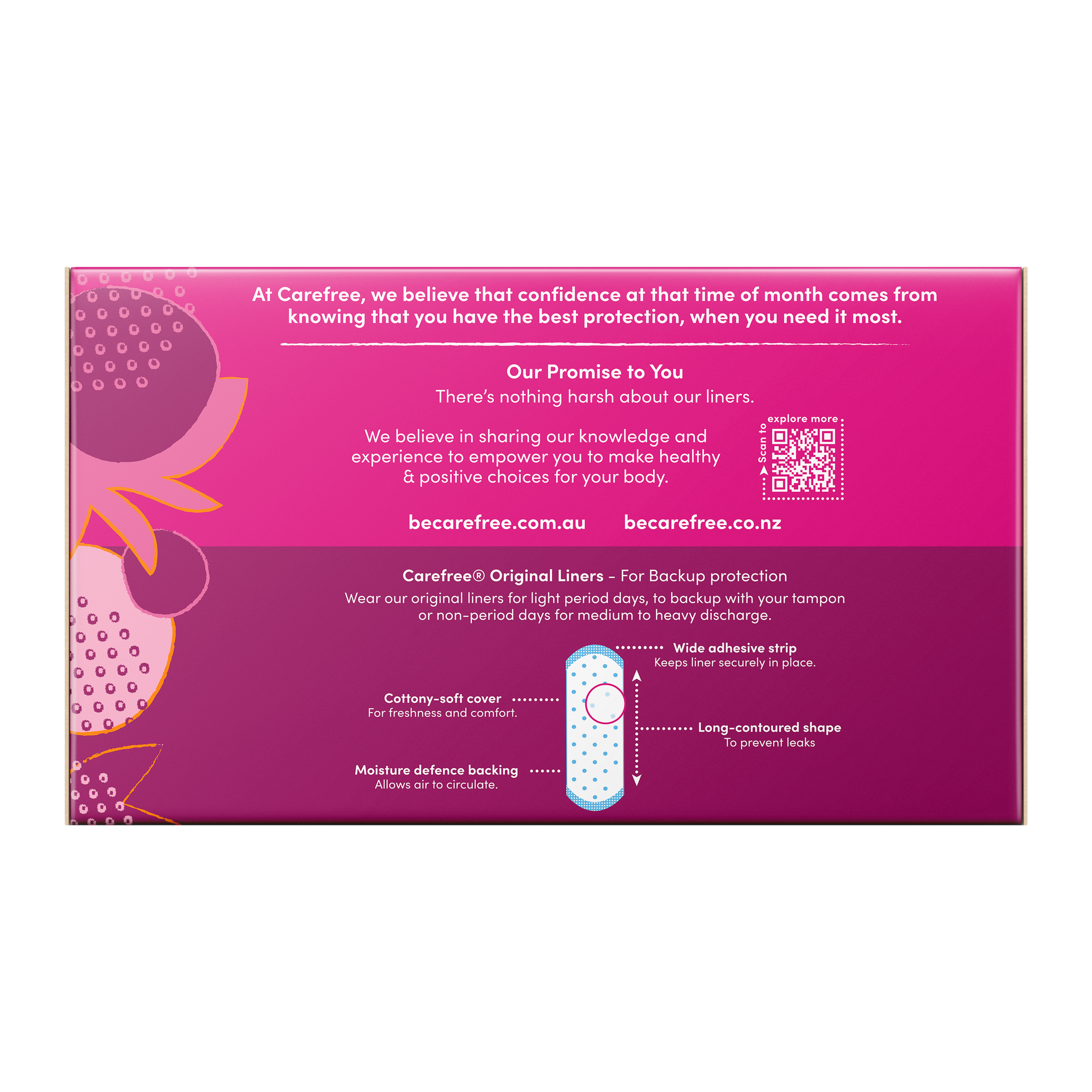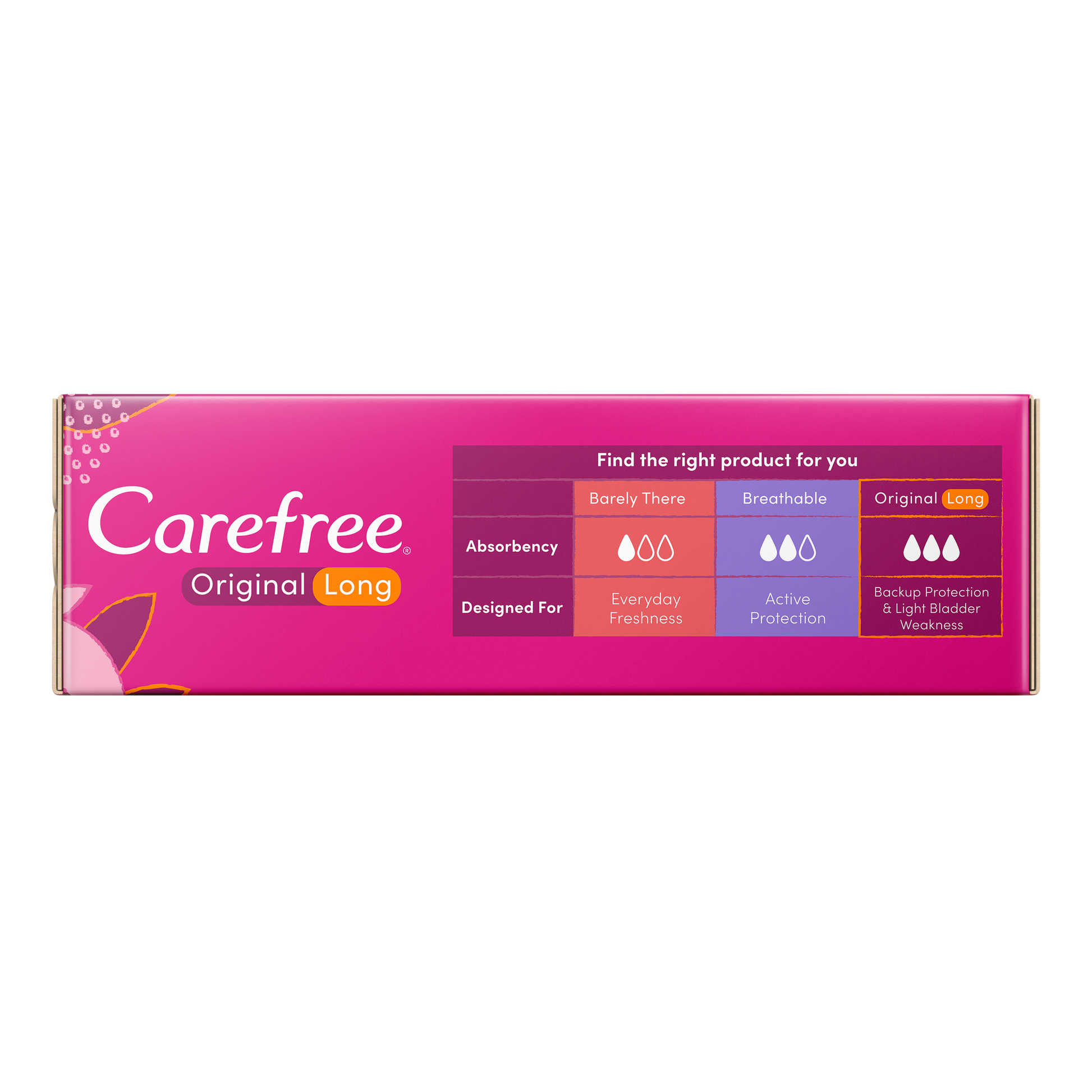 CAREFREE® Original Long Liners are 25% longer* to provide you with extra coverage if you’re experiencing heavier discharge or spotting. These absorbent liners are designed with a textured moisture proof backing to give you extra protection and the wide adhesive strips help keep the panty liner securely in place.