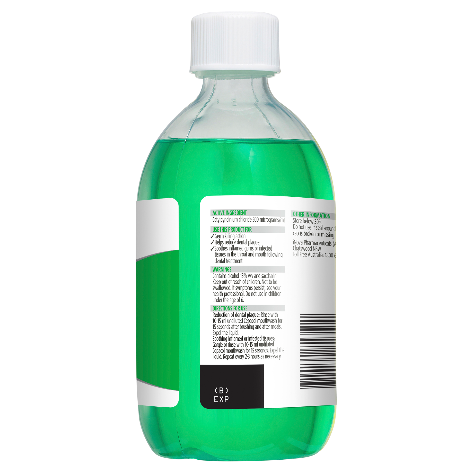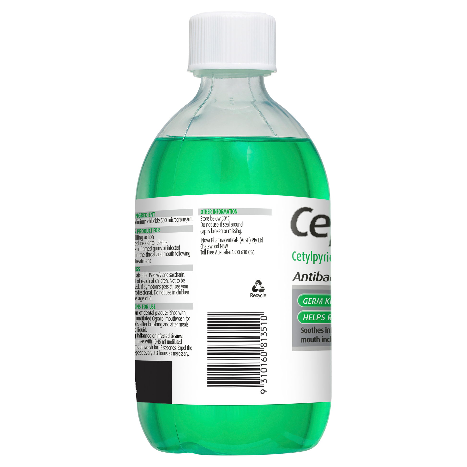 Mint flavoured Cepacol, is an antibacterial mouthwash. It helps soothe infected/swollen tissue in the mouth & throat. It also assists in removing dental plaque & killing germs.