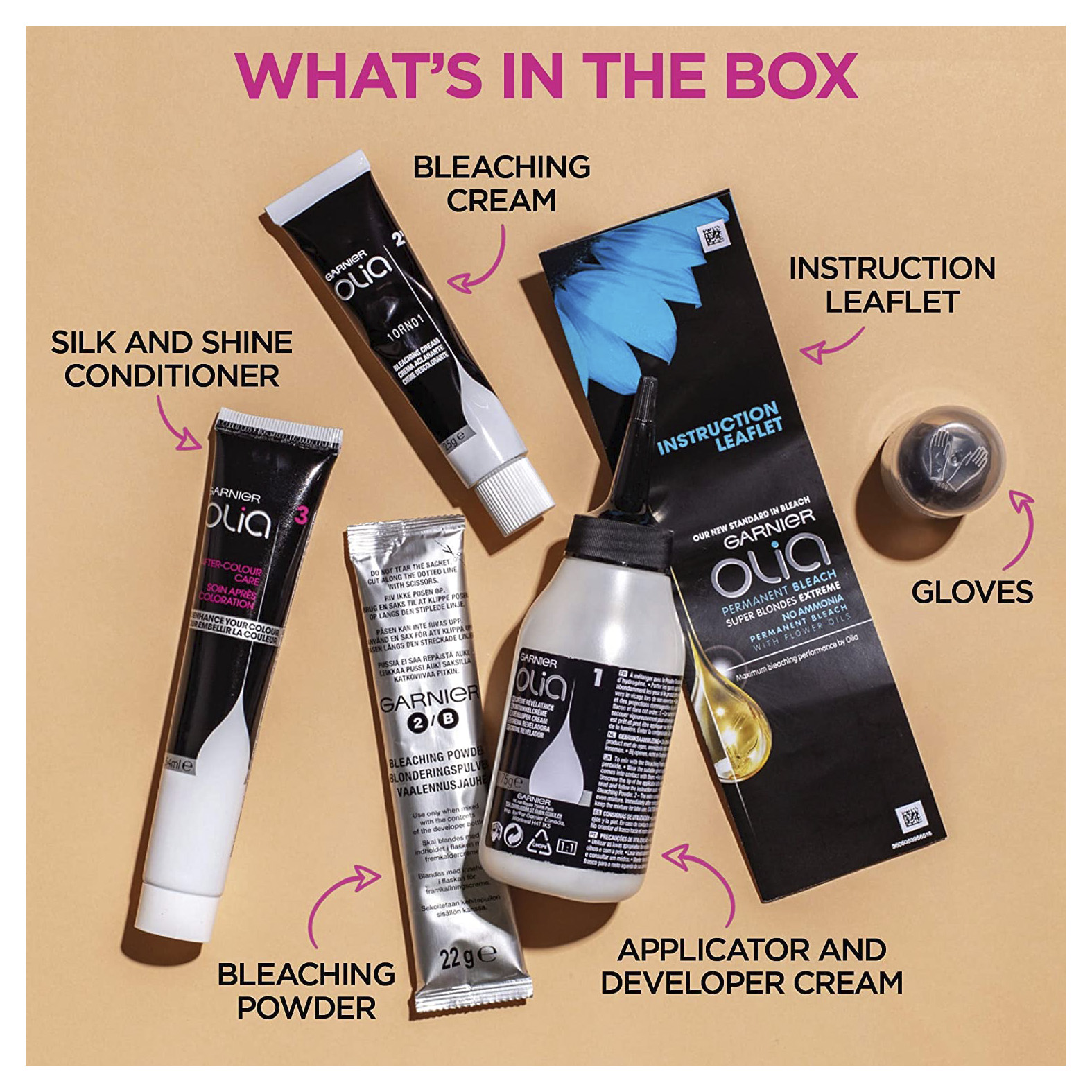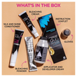 Box includes: 1 tube bleach crème with a velvety texture & subtle floral fragrance, 1 bottle developer cream, 1 sachet of bleaching powder, 1 tube of the silk & shine multi-application conditioner, 1 pair of gloves and 1 instruction leaflet.