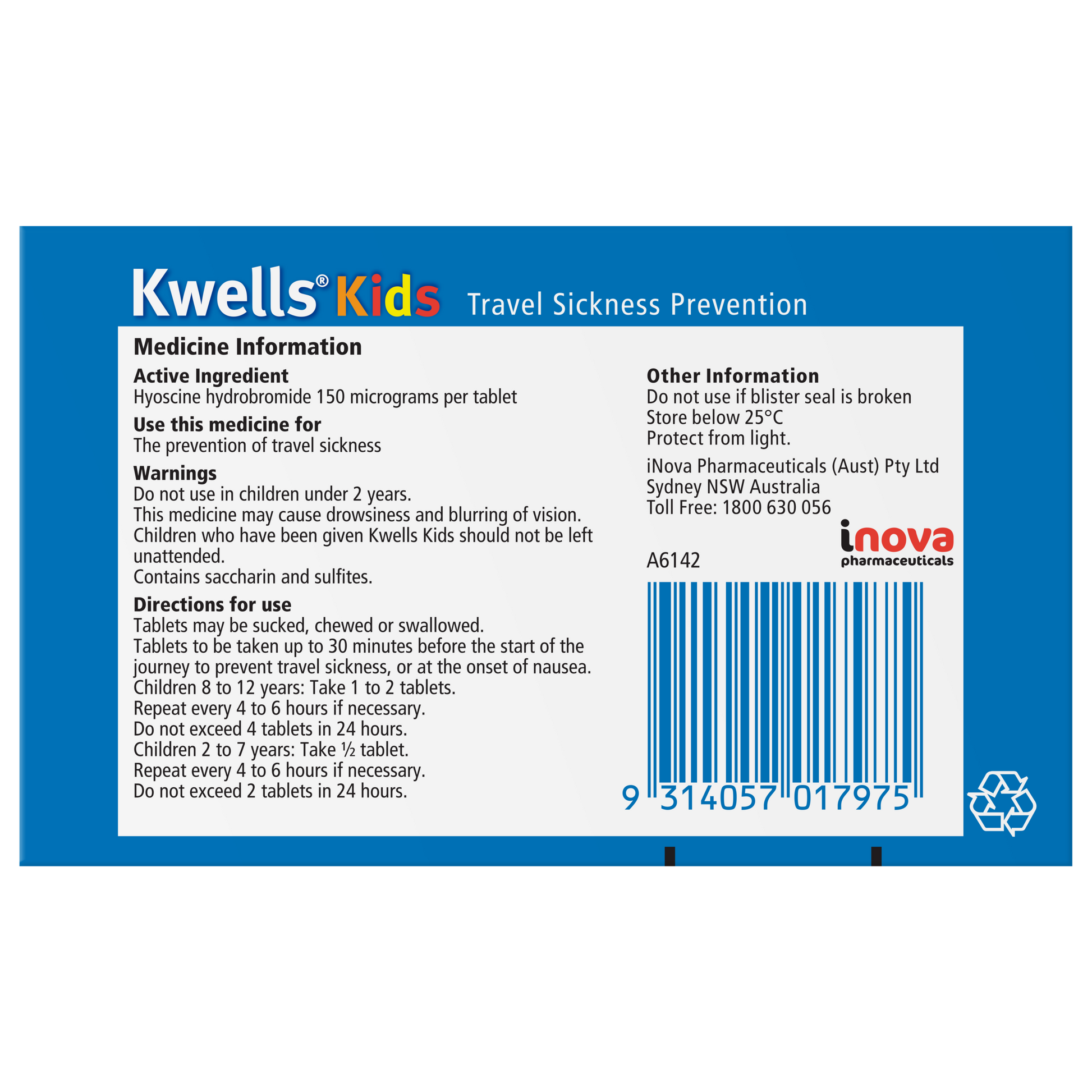 Kwells Kids Travel Sickness Tablets help prevent travel sickness in children between the ages of 2 to 12. These tablets are caffine free and can be chewed, swallowed or sucked 30 minutes before travelling. Kwells can be used when travelling by boat, car, coach, plane or train.