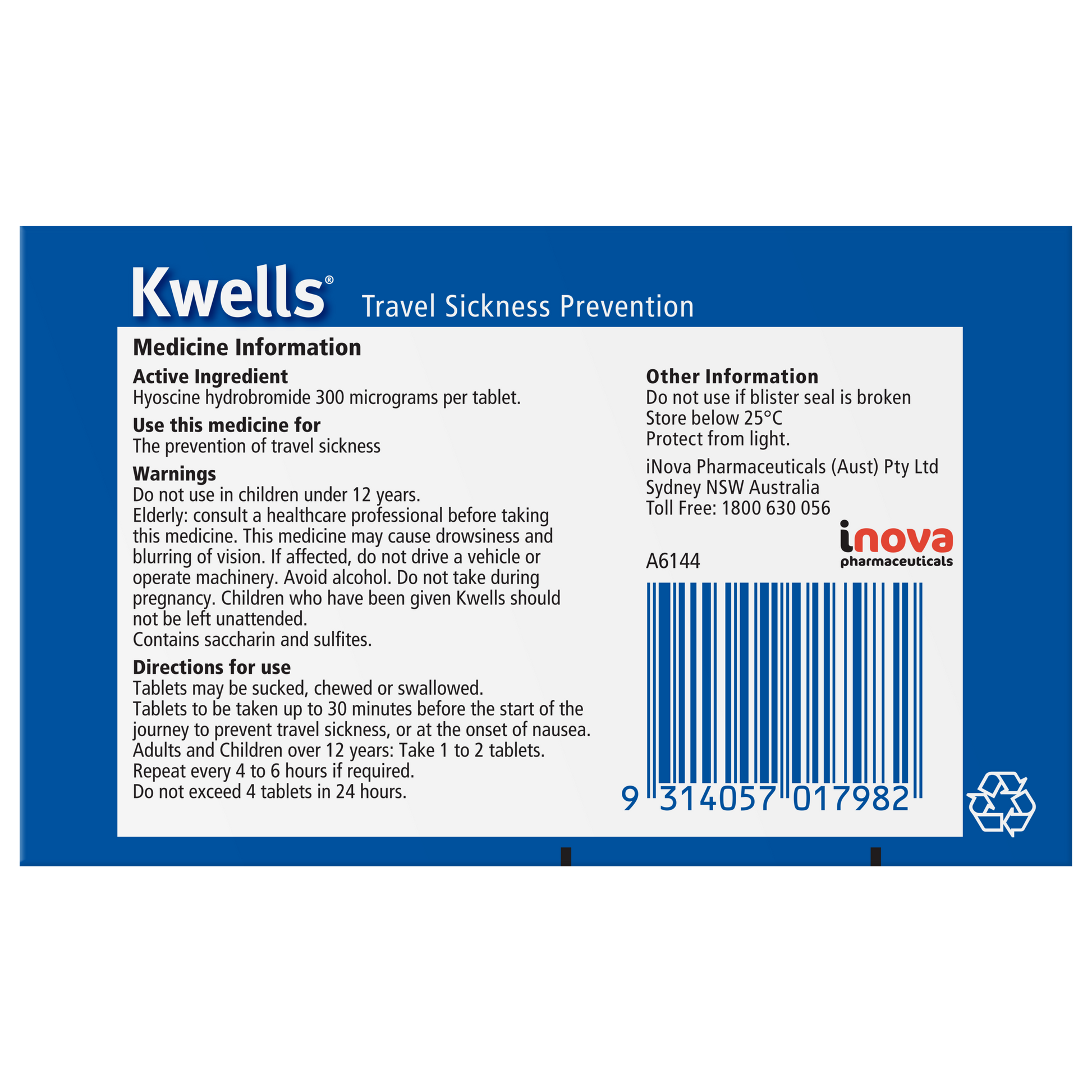 Kwells travel sickness tablets help prevent travel sickness in adults and children over the age of 12. These tablets are caffine free and can be chewed, swallowed or sucked 30 minutes before travelling. Kwells can be used when travelling by boat, car, coach, plane or train.