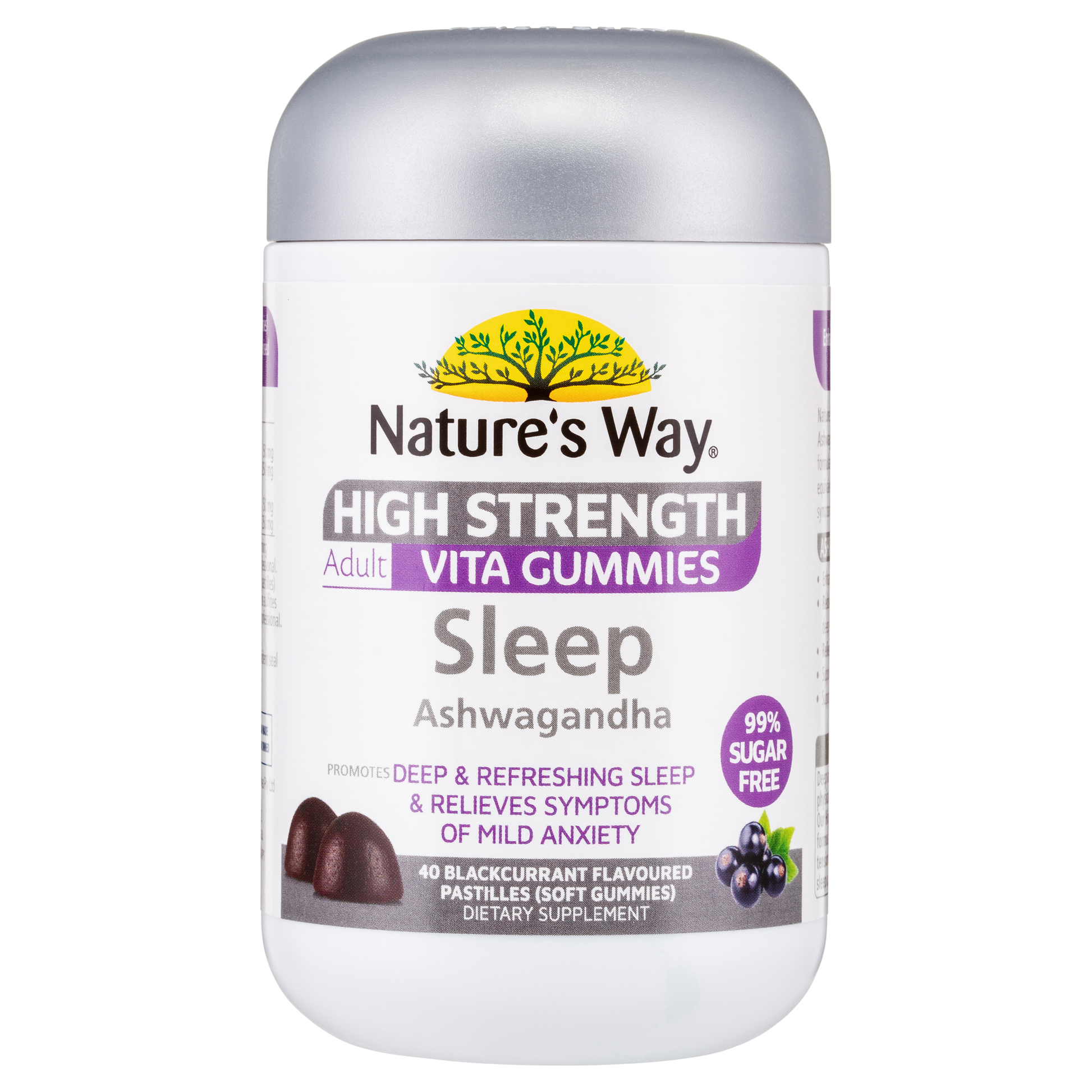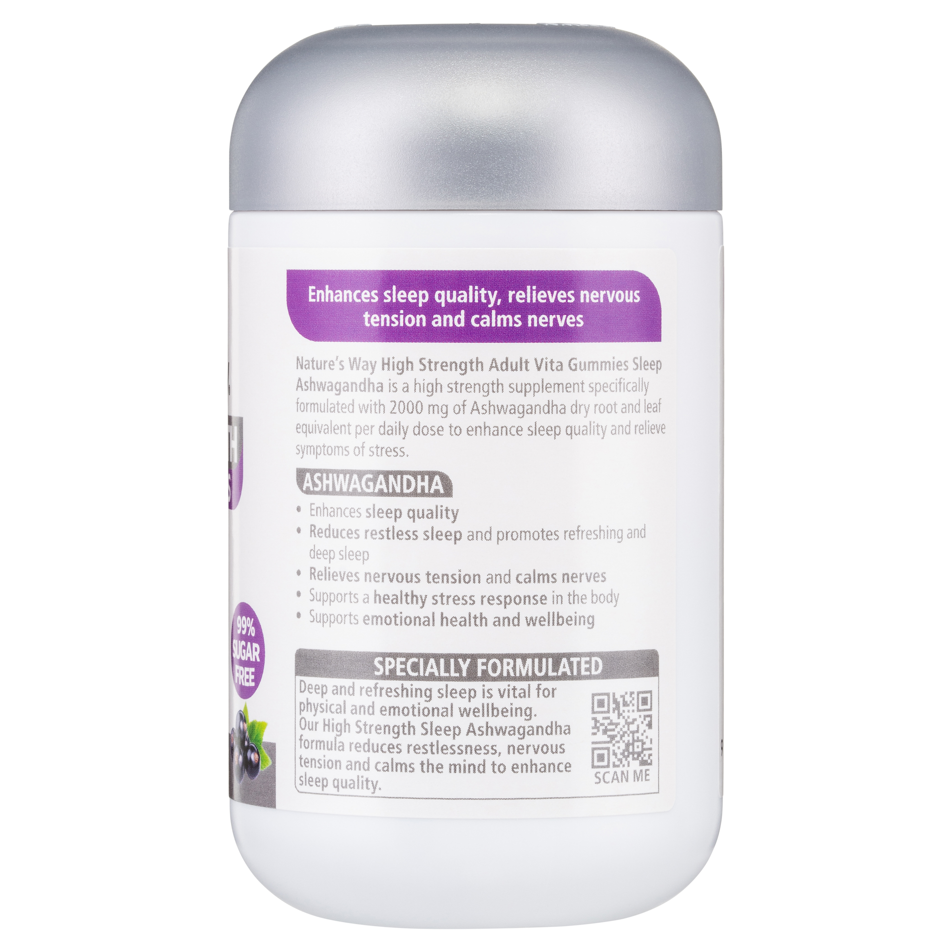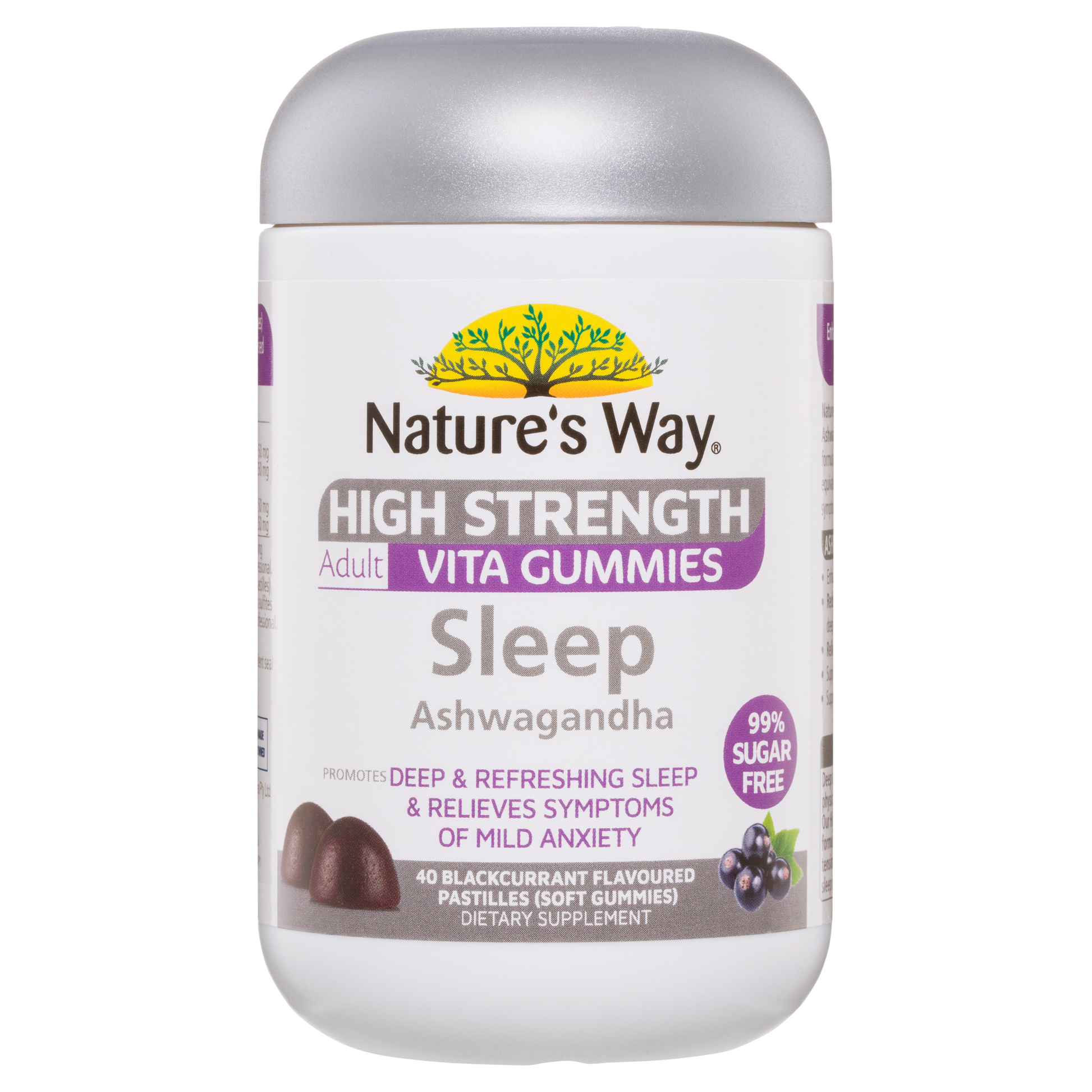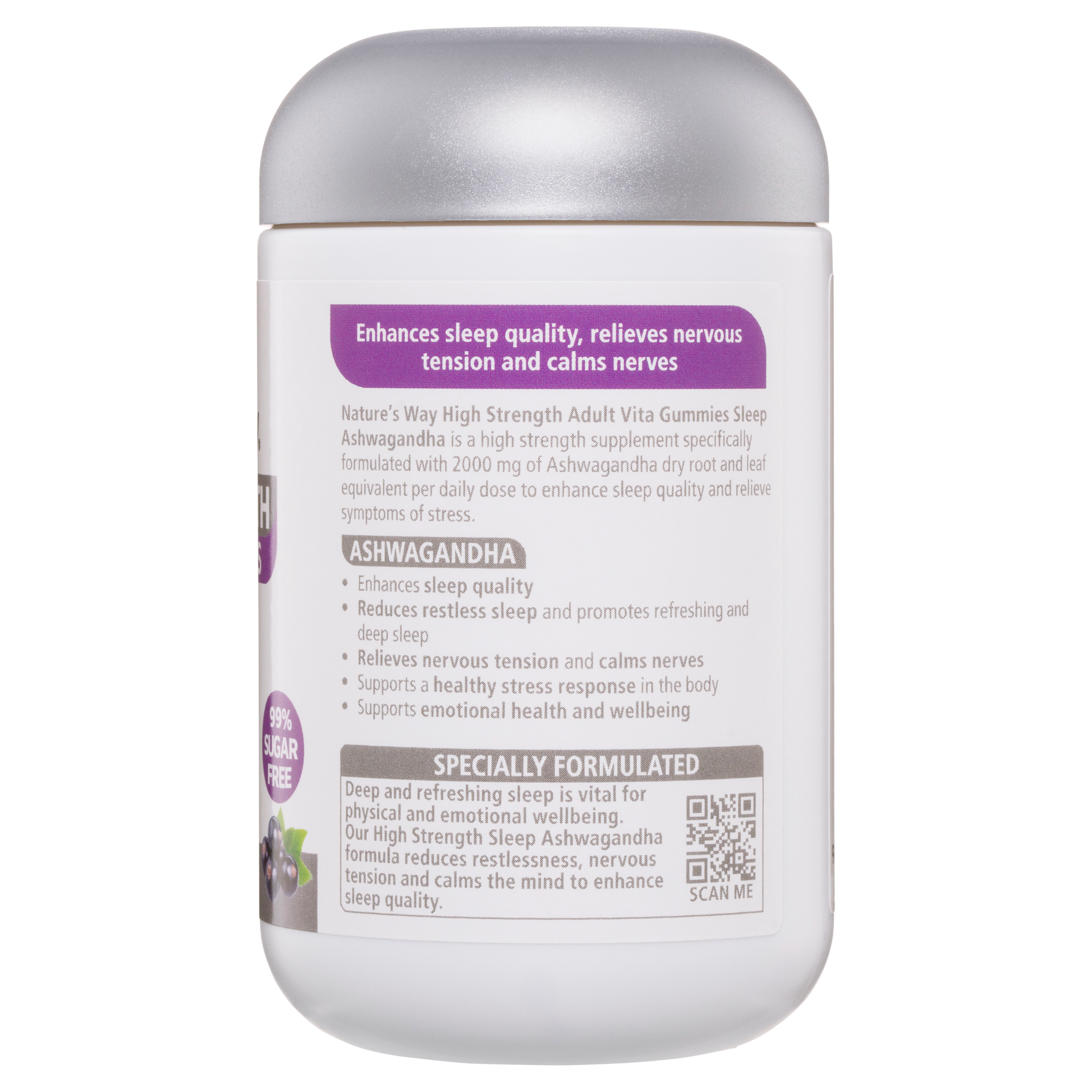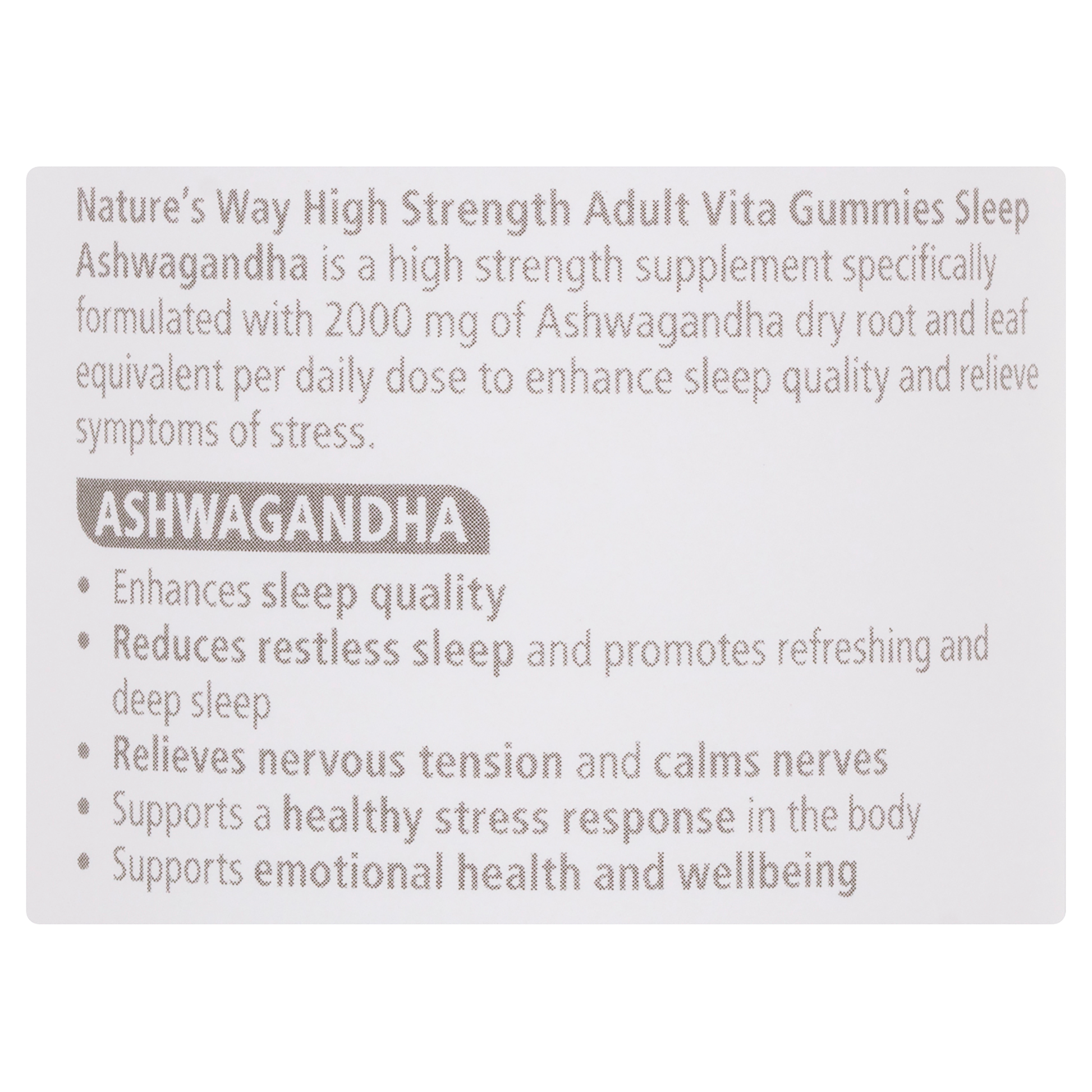 Nature's Way High Strength Adult Vita Gummies Sleep Ashwagandha has 2000mg of Ashwagandha per dose. It enhances sleep quality, relieves nervous tension & calms nerves.
