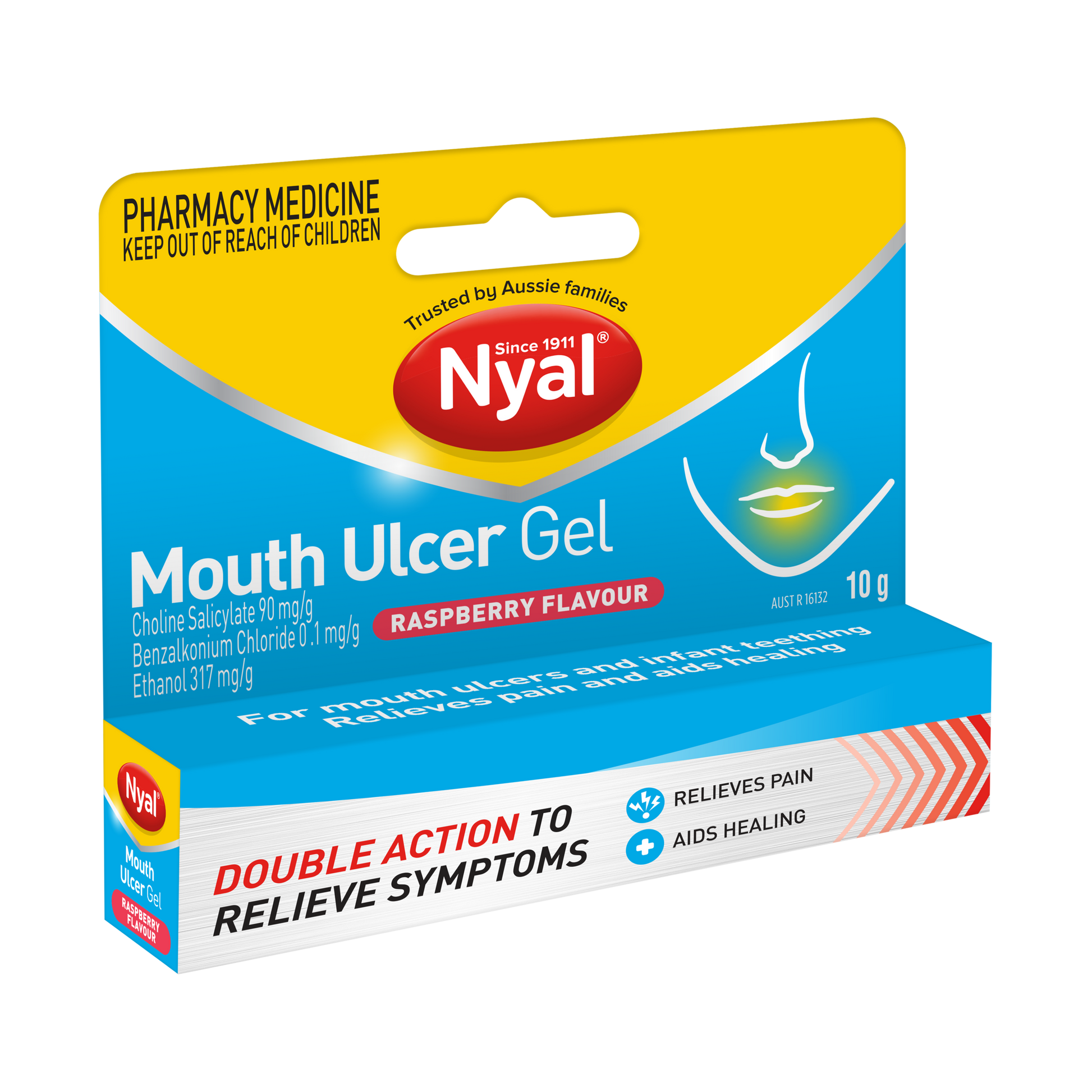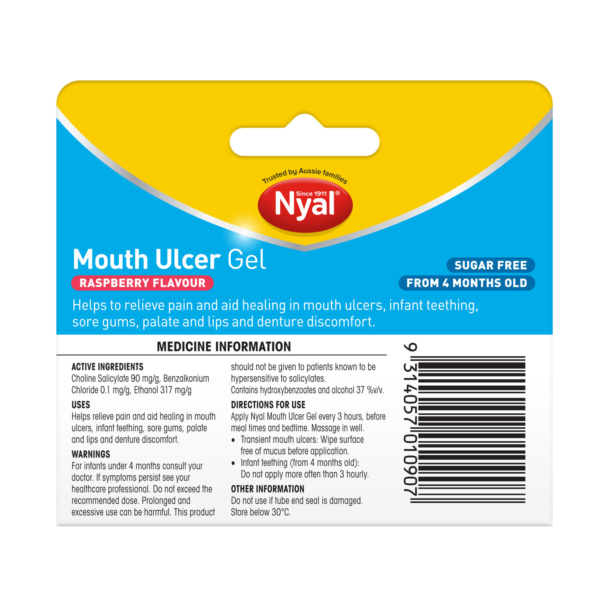 Sugar free Raspberry flavoured mouth ulcer gel by Nyal, helps provide relief from the pain & discomfort caused by mouth ulcers, infant teething, and sore gums. It also helps relieve palate, lips, and denture discomfort.